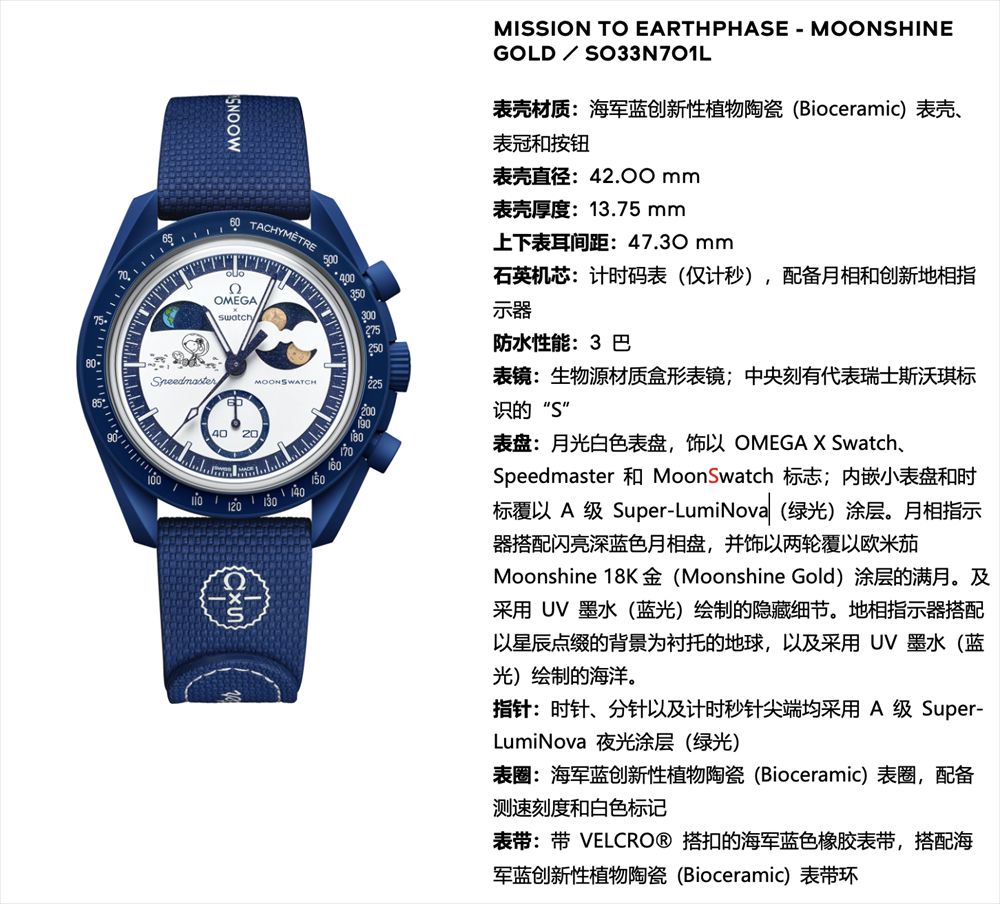 表盘与表冠上骄傲饰有 OMEGA X Swatch 联名标志,表壳背面刻有使命宣言。电池盖设计风格灵感来自地球,海军蓝色 VELCRO® 橡胶表带增添航空时尚气息。