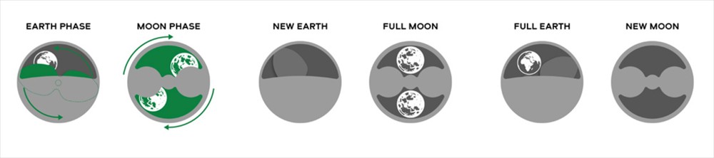 地相(地球相位)是瑞士斯沃琪去年推出的创新复杂功能,能显示从月球上远眺地球所见到的景象。地相与月相一样,周期为 29.5 天,但方向相反。满月之时,我们能看到新地,而当新月出现,我们将看到满地。这种逆向关系让地相上的地球呈逆时针方向移动,与月相指示器上月亮的运动方向相反。这以极富诗意的方式重新演绎了一些高端腕表所具备的逆跳功能。