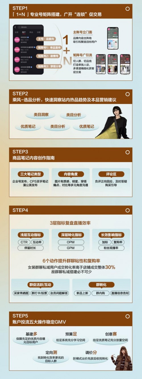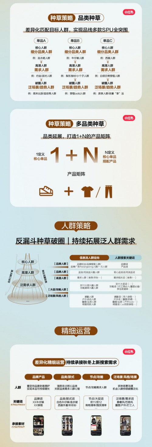 高效种草:小红书以科学化指标体系支撑精准人群触达,围绕用户真实的穿搭场景与风格偏好,优化种草内容策略;并通过独有的「人群反漏斗模型」帮助品牌撬动更广阔的泛人群增量市场。同时,结合搜索行为数据定制关键词策略,实现“人找货”场景衔接,提升种草转化效率。