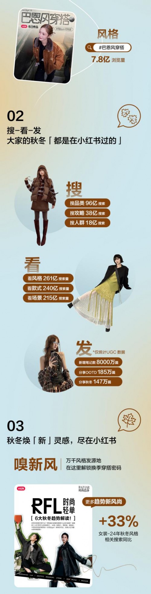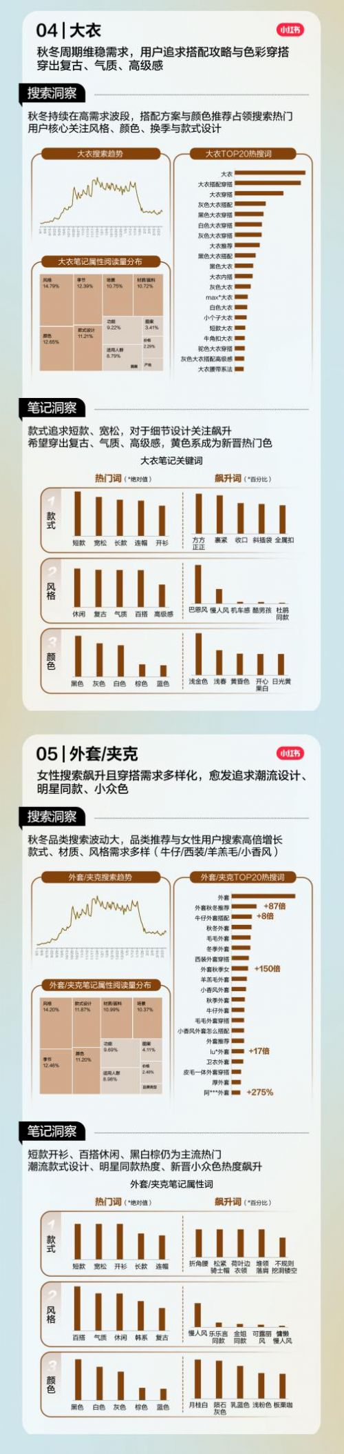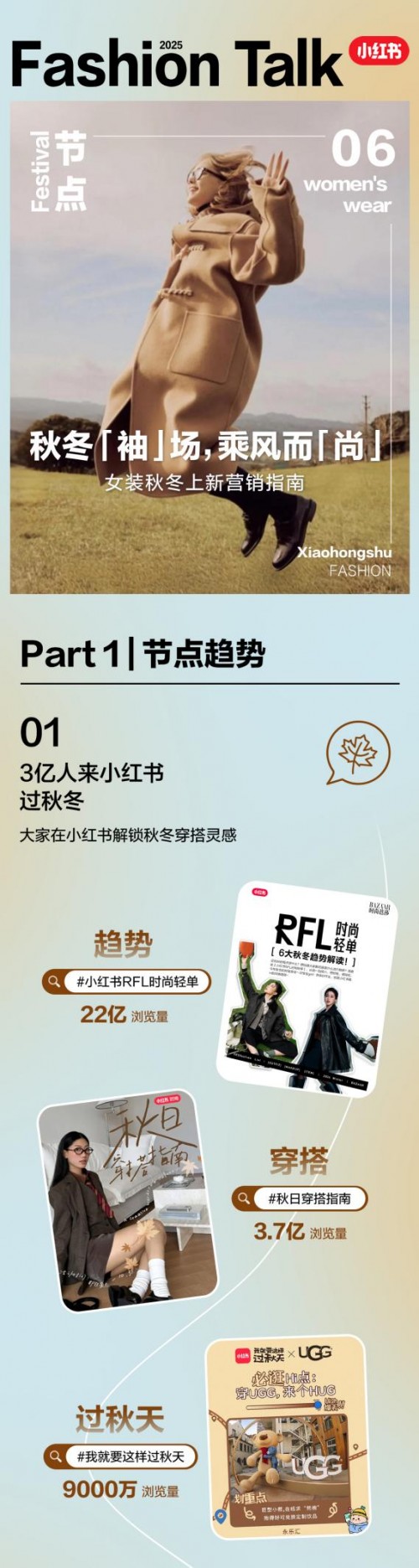 本期小红书带来「女装秋冬上新营销指南」,基于秋冬季女装潮流风向,以「节点趋势、品类洞察、营销解法」三个维度展开深度营销洞察,帮助更多女装品牌把握季节焕新生意节点,成功找到上新营销的种草方向感。
