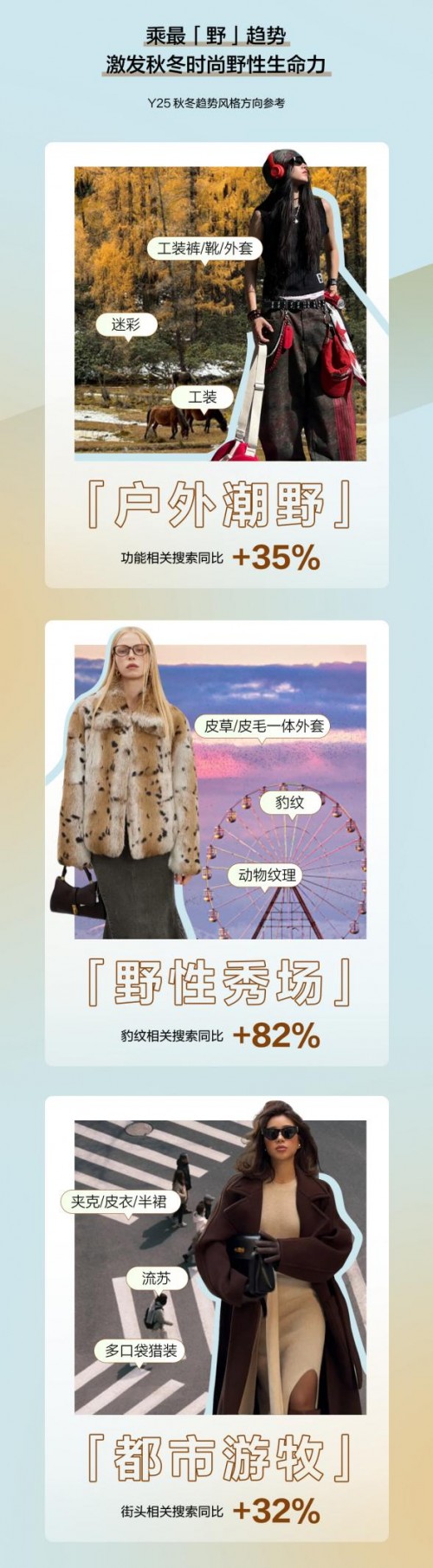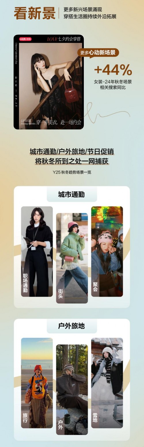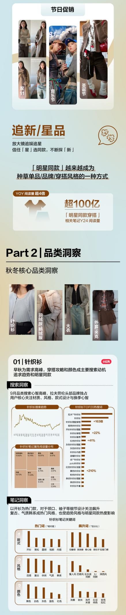 小红书站内25年女装秋冬趋势「新风」凸显,以生活方式为主的新兴穿搭场景涌现,城市通勤、户外旅地、节日促销等多元场合下的穿搭趋势成风;同时用户在追新/星品上的种草心智日益成熟,24年小红书围绕「明星同款穿搭」相关笔记阅读量超100亿,「明星同款」逐渐成为种草单品,形塑穿搭风格的方式之一。