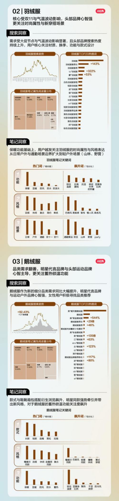 受大促节点和气温波动影响,「羽绒服」搜索热度将持续上升,用户对功能性要求提升的同时,也更加关注其时尚属性与户外新场景穿搭;