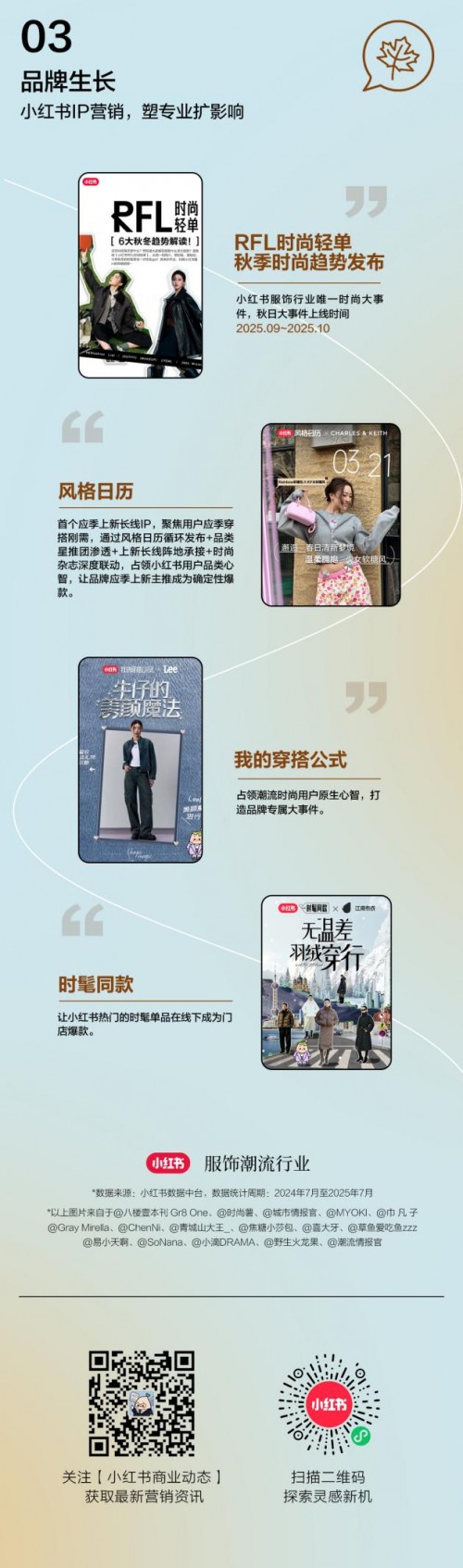 品牌生长:小红书IP化内容矩阵为品牌提供行业发声的高势能舞台。「RFL时尚轻单」、「风格日历」、「我的穿搭公式」、「时髦同款」多样化IP,以趋势发布、风格定义、场景演绎等形式,引领大众审美风向,助力品牌从“单品上新”升级为“风格上行”,持续深化品牌传播影响力。