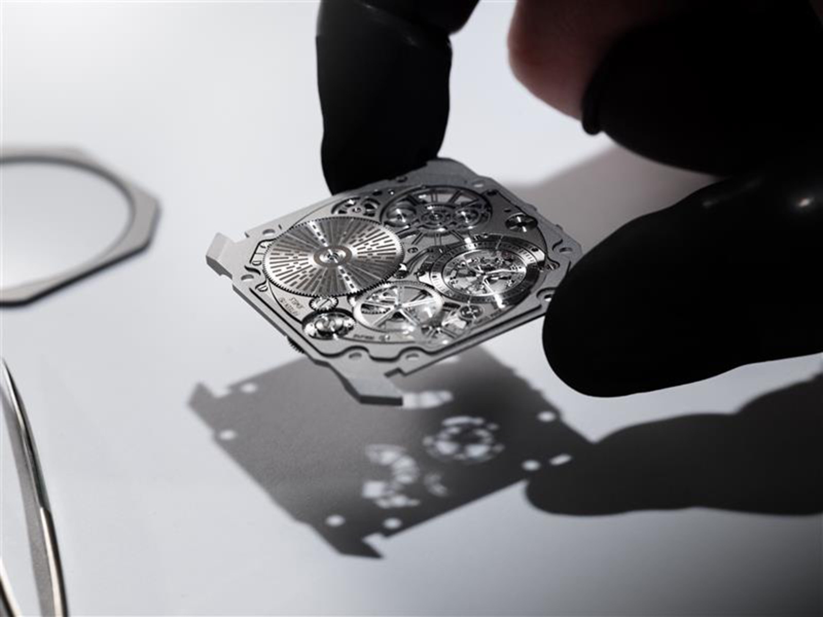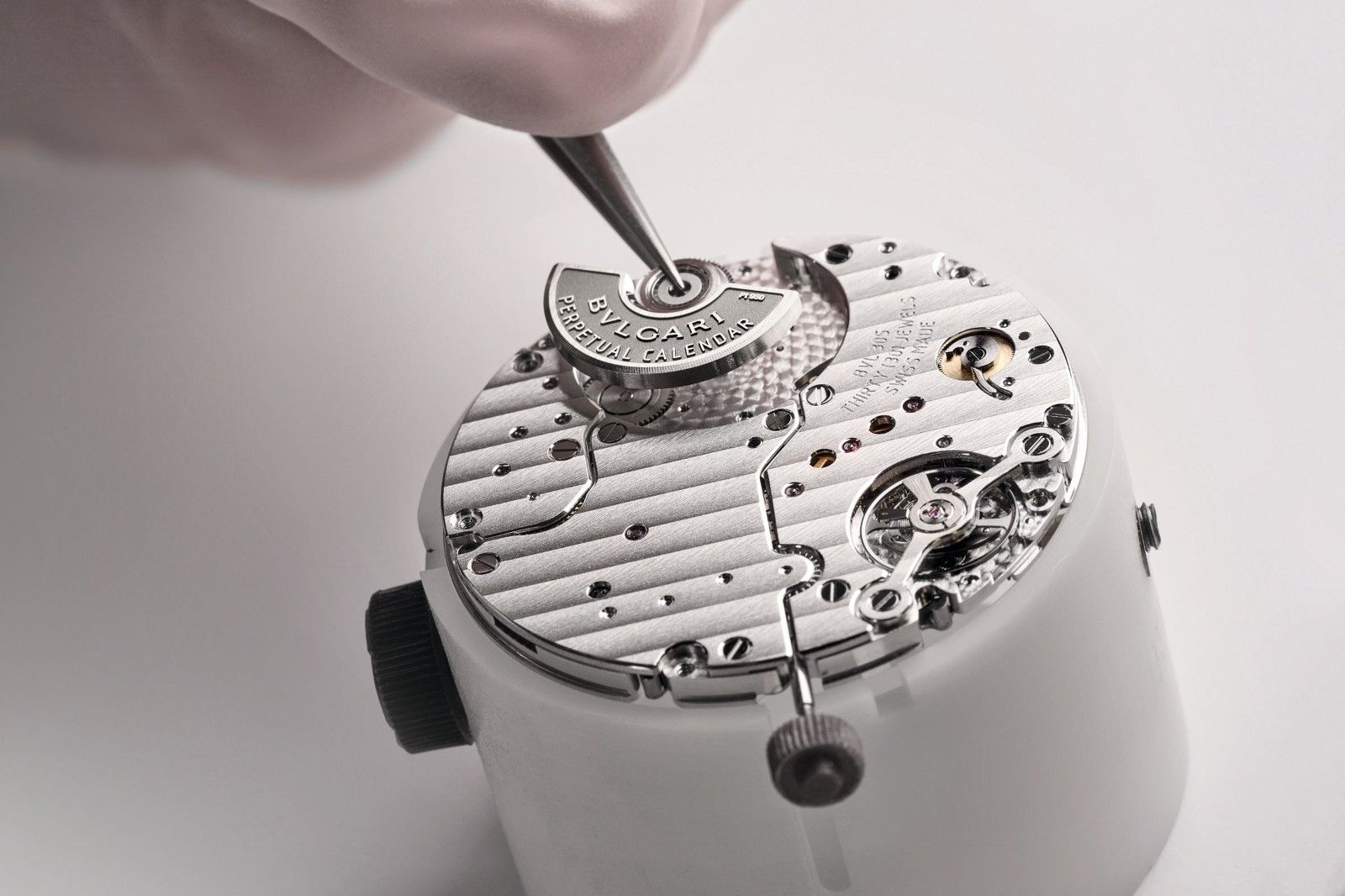 宝格丽制表师组装Octo Finissimo万年历腕表的BVL 305机芯(厚2.75毫米)(2021年)及组装Octo Finissimo Ultra陀飞轮腕表的BVF 900陀飞轮机芯(2025年)