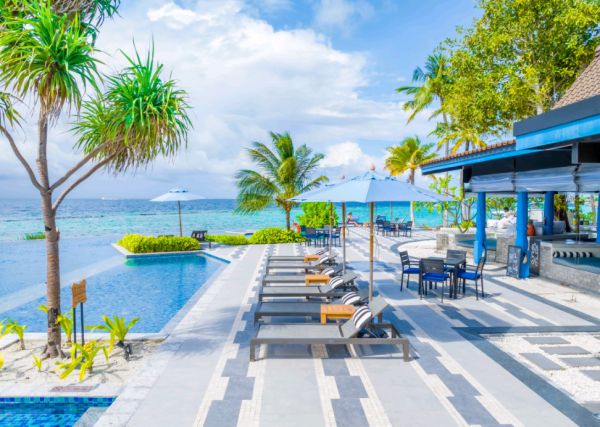 酒店的建筑灵感源自马尔代夫传统渔船"多尼船"的流畅线条,纯白色调的主体建筑与蔚蓝的海水、澄澈的天空构成一幅浑然天成的画卷。天然木材、手工编织物和海洋灵感的色调,在极简的框架下注入波西米亚的自由灵魂,营造出慵懒而精致的氛围。