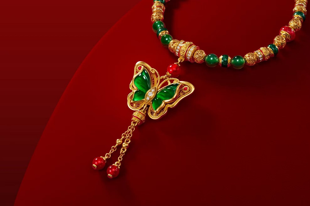 “福蝶知春”以莹润翡翠雕琢为蝶翼,层次分明,灵动生姿,宛如春风中振翅轻颤;黄金勾勒蝶翼轮廓,为蝶身带来一抹晨曦金光;珍珠钻石悄然点缀,犹如蝶翼轻沾朝露。深翠流转,金丝游走,一点红宝石点缀其间,也恰如紫禁宫墙映照落日熔金,再现古典美学之华贵神韵。