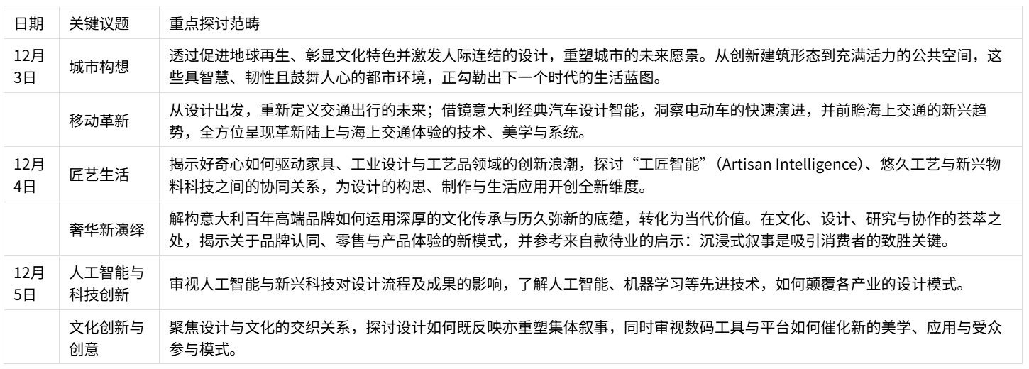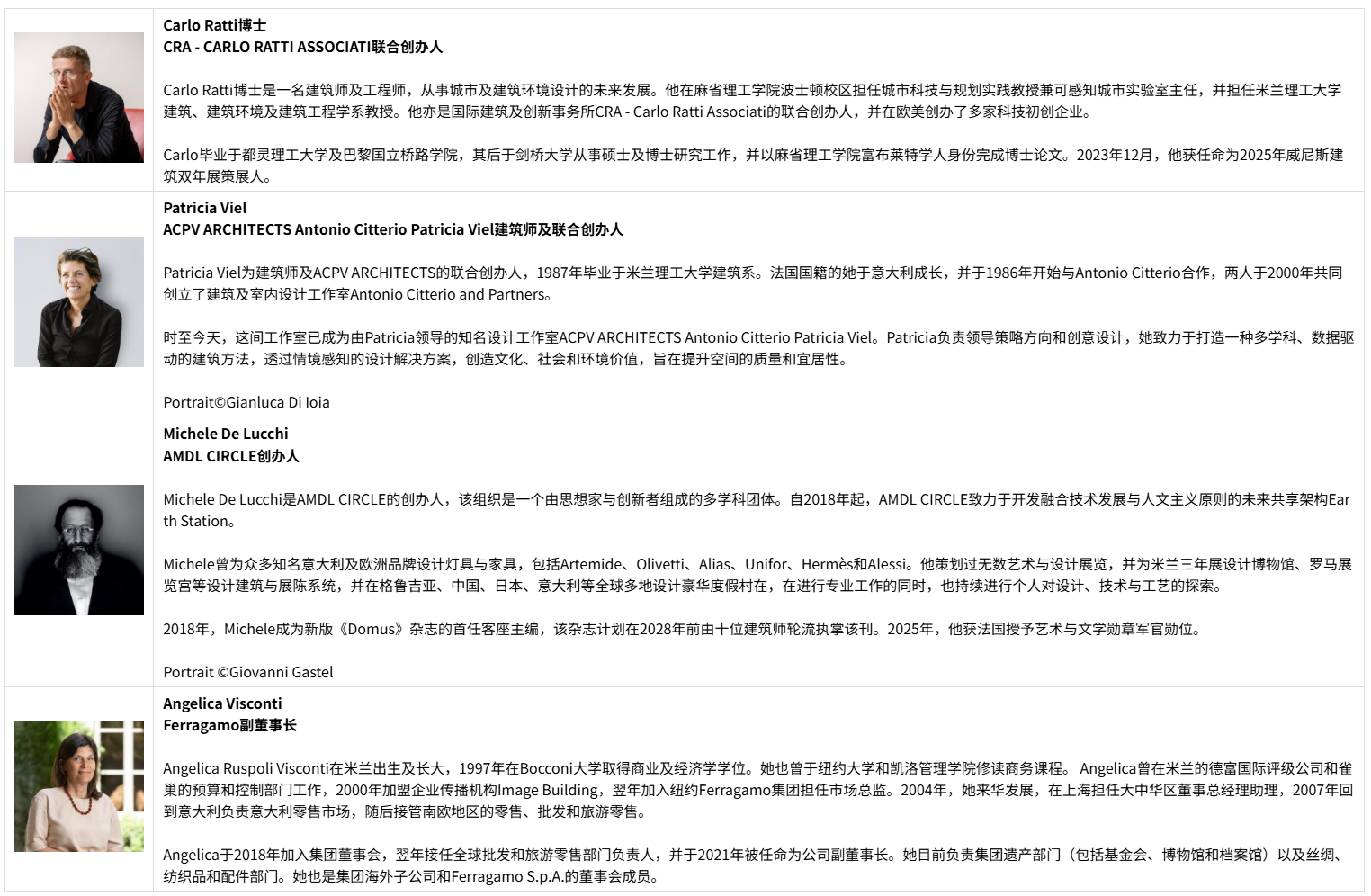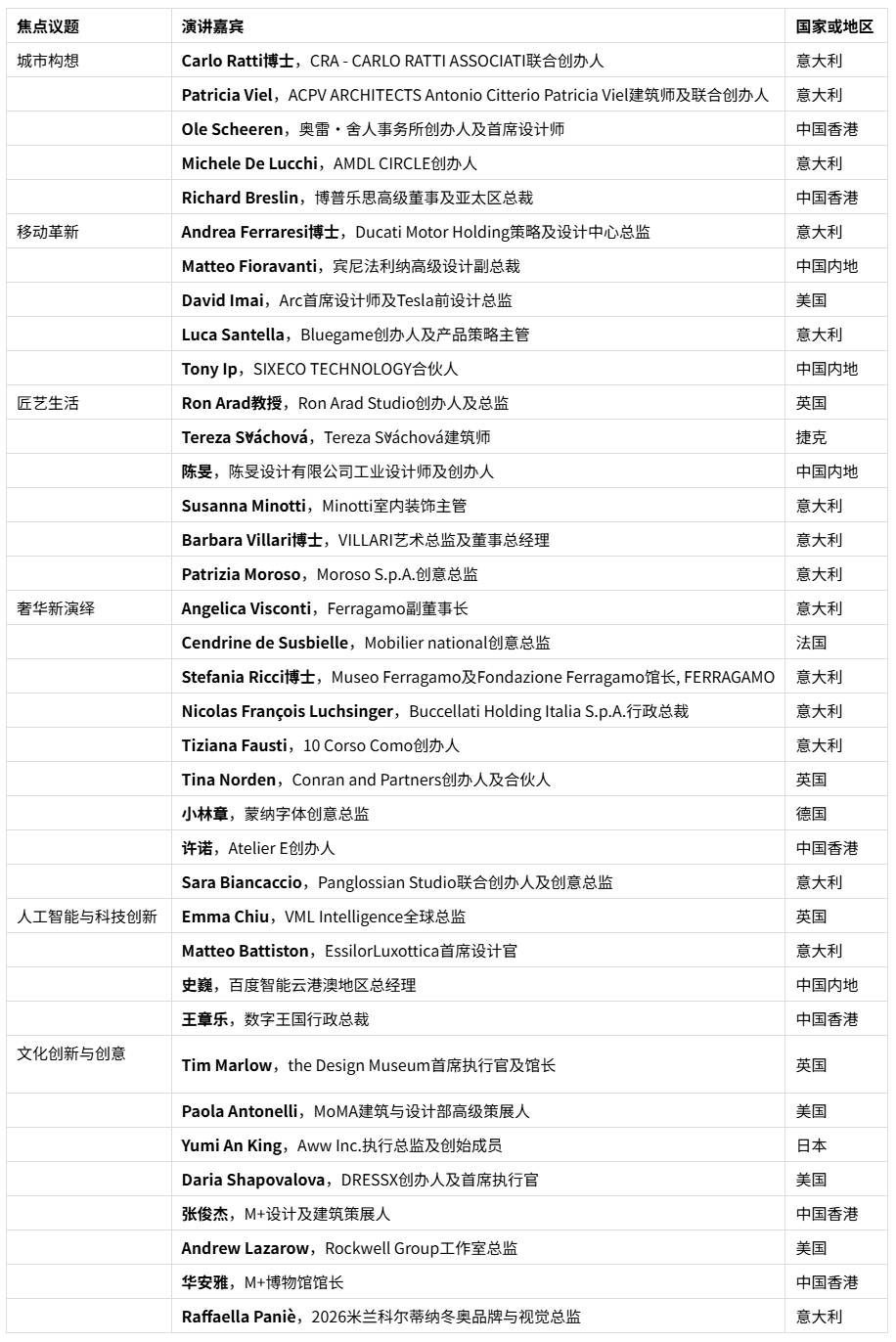国际设计盛会:汇聚全球顶尖设计师,包括2026年米兰科尔蒂纳冬季奥运会及残奥委会火炬设计师Carlo Ratti博士、大阪世博展馆建筑师 Michele De Lucchi,以及来自Ferragamo、Buccellati、EssilorLuxottica、the Design Museum、蒙纳等的国际创意领袖。