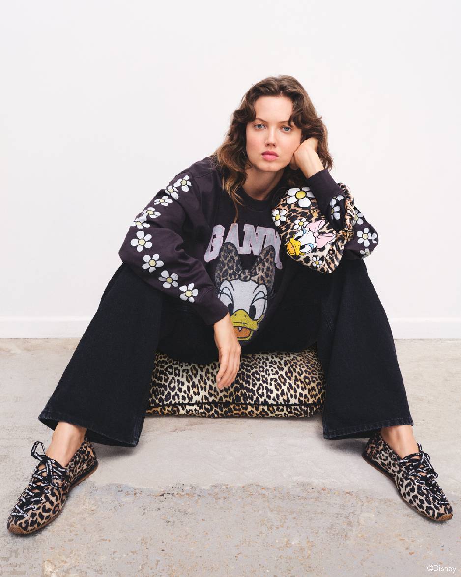 丹麦哥本哈根——2025年11月4日——GANNI 与迪士尼首次携手推出特别版联名系列。以全新形象演绎迪士尼经典角色——黛丝(Daisy Duck),灵感源自充满态度的 GANNI Girl 精神。