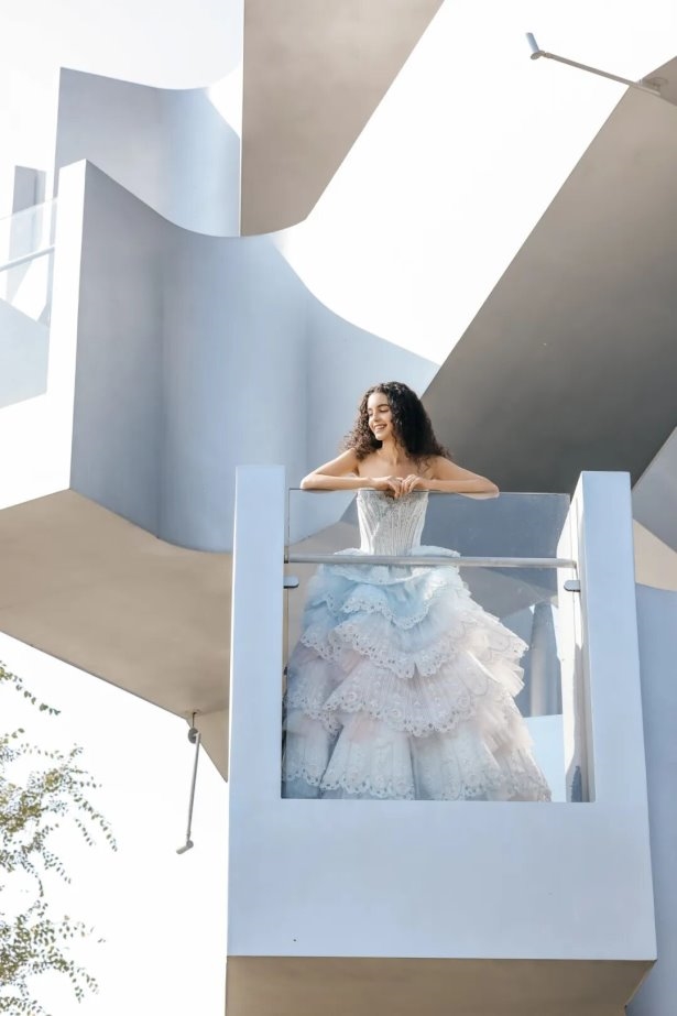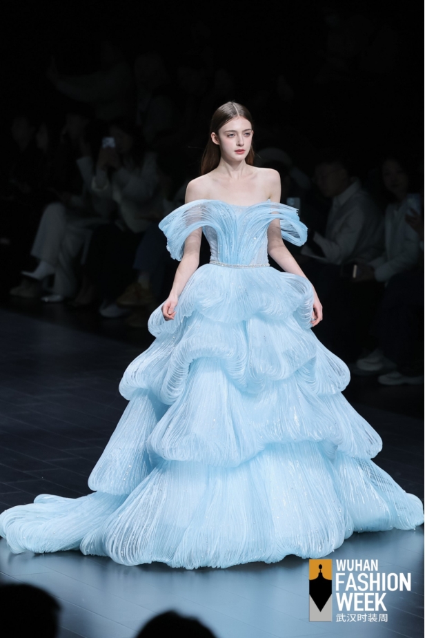 高定诗意融水韵,流光溢彩展匠心。世界著名华裔设计大师Professor Jimmy Choo OBE,周仰杰亲自指导的THE ATELIER带来“潮汐絮语”系列,以《草叶集》为灵感,将潮汐律动缝进2026春夏系列。设计师从诗意水韵中汲取灵感,以非对称剪裁与波浪裙摆勾勒水的万千姿态,施华洛世奇水钻与金属丝绣在面料上流转,宛若将整片湖光披于身。烫钻、亮片与薄纱叠映水色,银线绣出的波纹随步生光,精心打造的压轴之作,以进口面料与鱼骨勾勒出流畅线条,内衬的微型冷光灯串更是点睛之笔,在秀场光影中与水韵主题呼应,营造出如梦似幻的高定美学氛围,展现国际顶尖设计力量的精湛工艺与创意巧思。