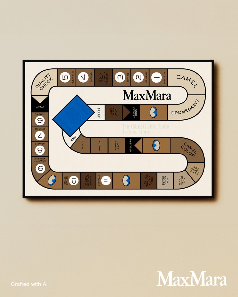 为了深入传递这一珍贵材质背后的工艺故事,Max Mara 特别推出了“驼绒寻秘”线上互动游戏。玩家将通过棋盘游戏的形式,深入东亚戈壁沙漠,认识双峰驼,了解珍贵驼绒如何诞生;走进 Max Mara 的工坊,体验原料的挑拣与分级,面料的织造修补与质检一系列流程,直至亲手“制作”一件经典大衣。通过互动设计与趣味场景,感受驼绒的温暖与品牌对工艺的执着追求。