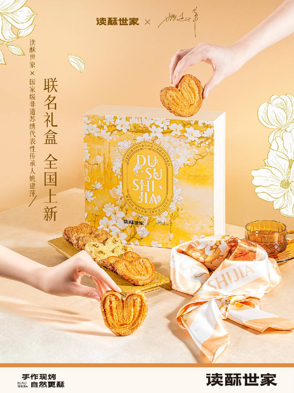 在品牌十二周年之际,读酥世家携手国家级非遗苏绣代表性传承人姚建萍女士,共同推出多款联名产品,涵盖蝴蝶酥与拿破仑酥等经典海派点心系列。此次合作以“非遗苏绣 × 海派烘焙”为主线,融合苏绣的艺术语言与海派点心的制作工艺,向消费者传递东方美学的深厚魅力。