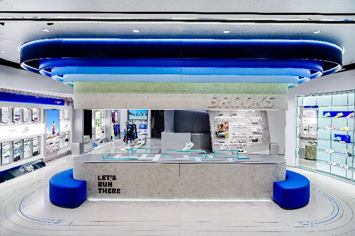 在空间呈现上,门店大量运用微水泥、哑光金属、超白玻璃与LED发光装置等材质,营造出冷静而克制的未来感基底,让图形语言与产品本身成为视觉焦点。灯光与结构形成有节奏的呼应,将抽象的运动能量转化为可被感知的空间体验,使门店不仅是零售场所,更是BROOKS跑步哲学的立体化呈现。