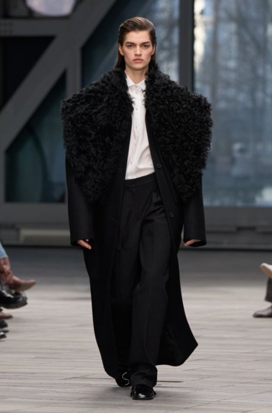 系列整体廓形修长挺括;精准的修身剪裁中,出其不意的露背设计与无袖细节,营造视觉张力;而精工打造的裙装则以对比鲜明的简约后背设计为特点,隐隐展露内搭层次。白色翻领利落醒目,机车领注入粗砺质感,羊毛皮领则于廓形羊毛外套上铺陈出恢弘气场。质感与色彩则勾勒都市格调,以中性色、低饱和色调为基底,间或点缀橘色与酒红提亮;面料涵盖挺括精裁羊毛、罗纹针织、垂顺丝绒、复合缎面、棉质面料、罗缎、抛光皮革,以及哑光与透明皮革。