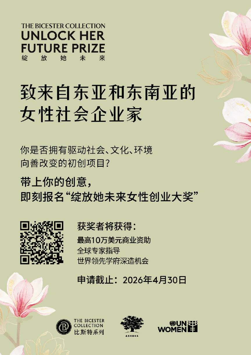 春风送暖,木兰花开。在属于女性的季节,比斯特系列(The Bicester Collection)正式启动2026年度“绽放她未来女性创业大奖”(Unlock Her Future Prize)报名通道,面向东亚及东南亚的女性社会企业家发出诚挚邀请。今年的颁奖典礼将于10月落地比斯特上海购物村,恰逢其开业十周年之际,彰显比斯特系列深耕中国、赋能区域女性创业者的长期承诺。