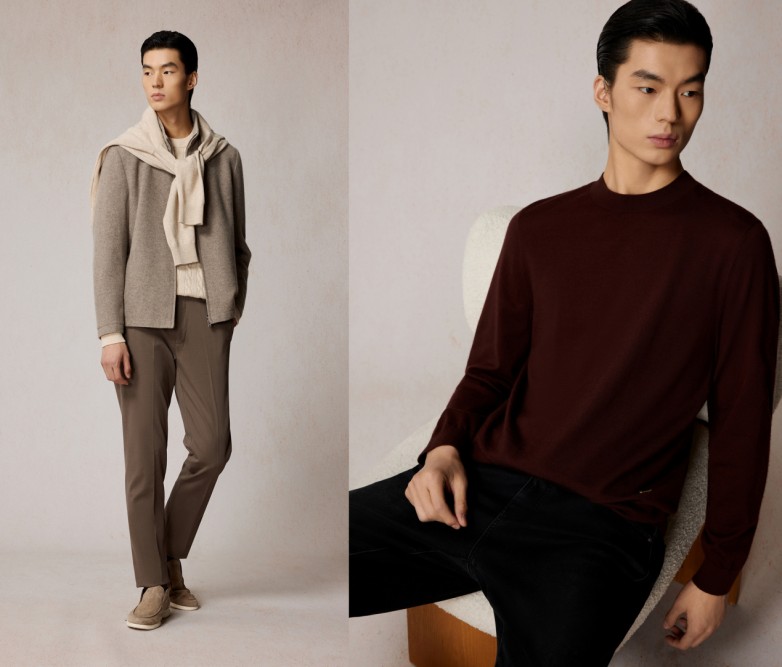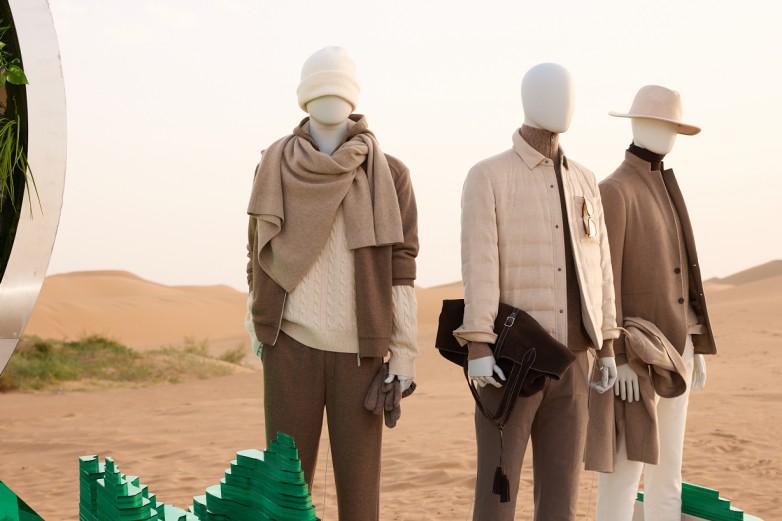 以本次活动重磅展出的阿拉善羊绒品类为例,其以“珍稀沙漠馈赠,守护绿洲的温暖奢品”为理念,臻选 Loro Piana 年度最佳羊绒大奖面料,源自昼夜温差 40°C 沙漠之境,材质自带温润细腻触感,兼具出色保暖性与轻盈质感,适配秋冬多场景穿着。同样出自阿拉善牧区的Loro Piana金奖羊绒被誉为“羊绒界劳斯莱斯”,仅甄选约14微米超细羊绒,纤维细度远超普通羊绒,触感极致细腻柔软且富有弹性,并且面料自带天然奢华光泽,视觉上尽显高端质感,兼顾了顶尖品质与可持续发展理念。云感丝羊绒则创新融合阿拉善羊绒与6A级桑蚕丝,以经典版型实现一衣多穿、一衣多季的实用功能,契合现代精英男士的长期主义价值观。