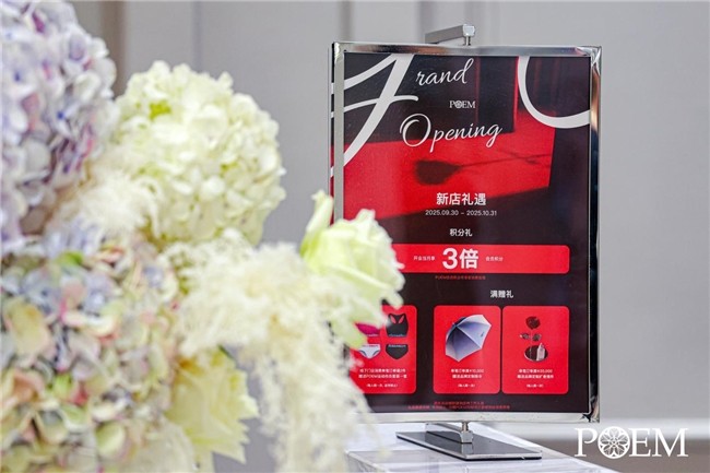 为庆祝开业,POEM推出多项限时礼遇。关注品牌社交媒体账号并发布相关内容,即可获赠定制扇子等精美礼品;单笔订单满额即赠品牌运动内衣套装、定制雨伞或扩香摆件,更享三倍会员积分礼遇;参与POEMBESTIE活动,分享穿搭故事即有机会获得100-1000元消费礼券,进一步深化品牌与顾客的情感链接。