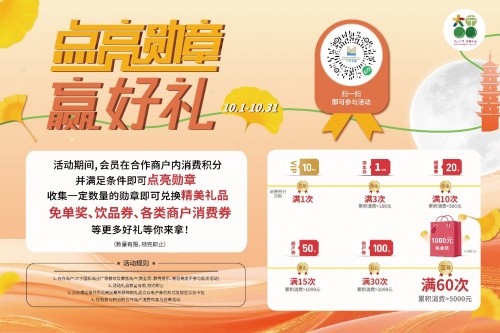 边逛边玩,大宁国际还准备了各类促销礼遇,在运动的同时及时补充能量、焕发新姿。10月18日-10月26日逢周末,广场积分商户单笔消费满288元并无感积分成功,即可获赠推送指定商户抵用券1张。整个10月,点亮勋章赢好礼,会员在合作商户内消费积分并满足条件,即可点亮勋章,收集一定数量的勋章即可兑换精美礼品免单奖、饮品券、各类商户消费券等好礼。(以上活动礼券均数量有限,赠完即止)