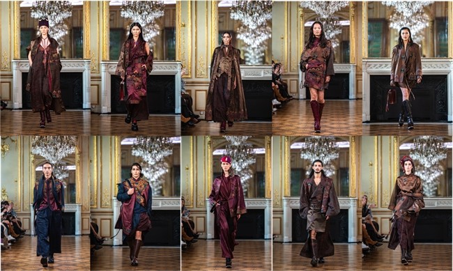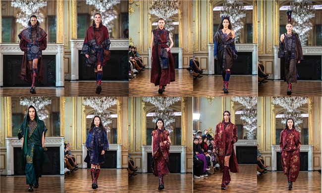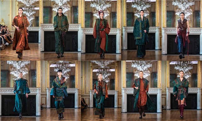 在自然的织物原材与匠心工艺中,感知神秘的东方人文。走心将 东方远古的浪漫遐想具象于设计,通过大量手工刺绣以及立体浮 雕、钉珠、非遗绳艺等工艺细节,经由设计师的精心组合与重构, 赋予服装更多的肌理与温度,将高级时装的手工温度与当代创意 表达完美结合,在波旁画廊灯光映照下绽放出细腻而璀璨的光芒。