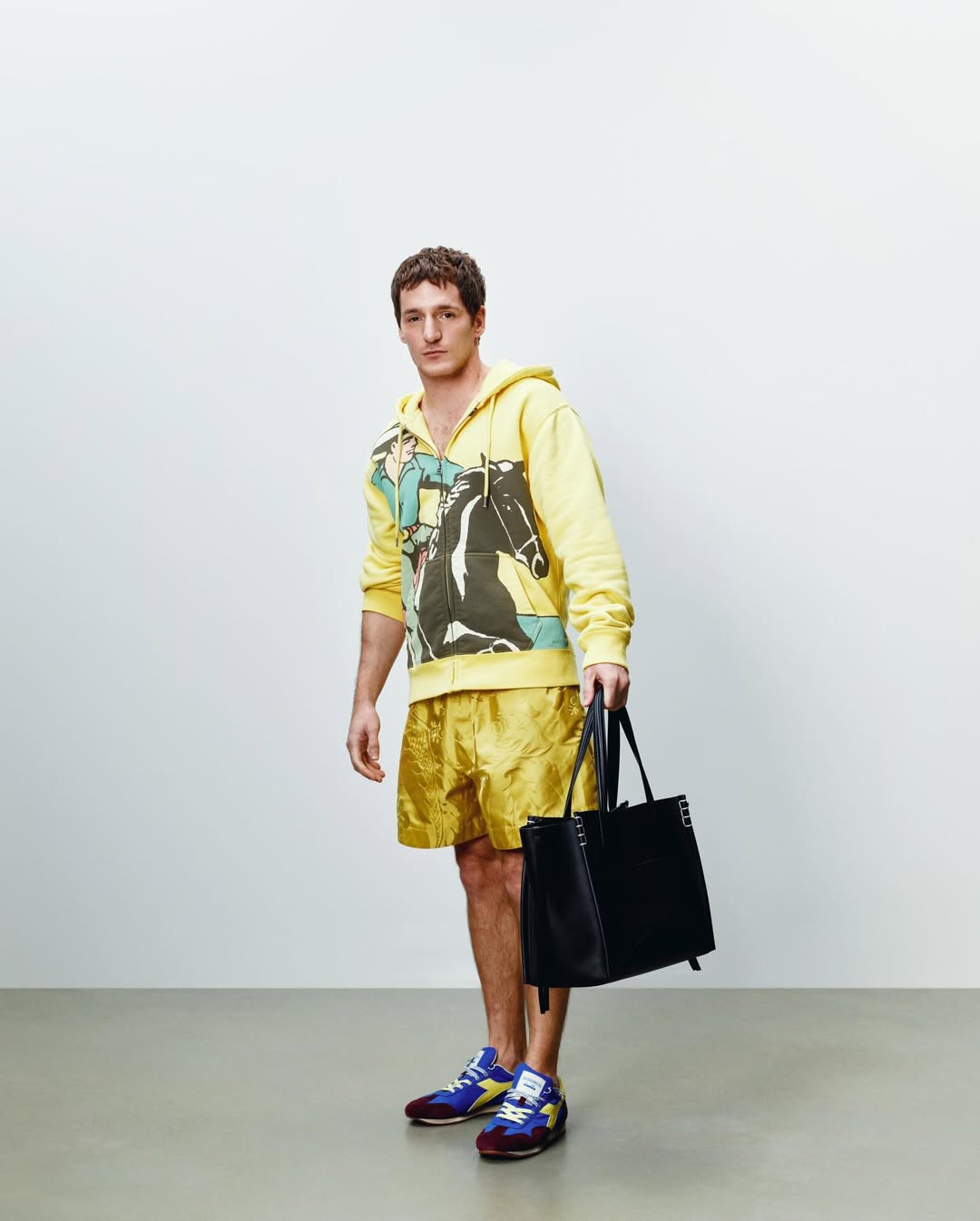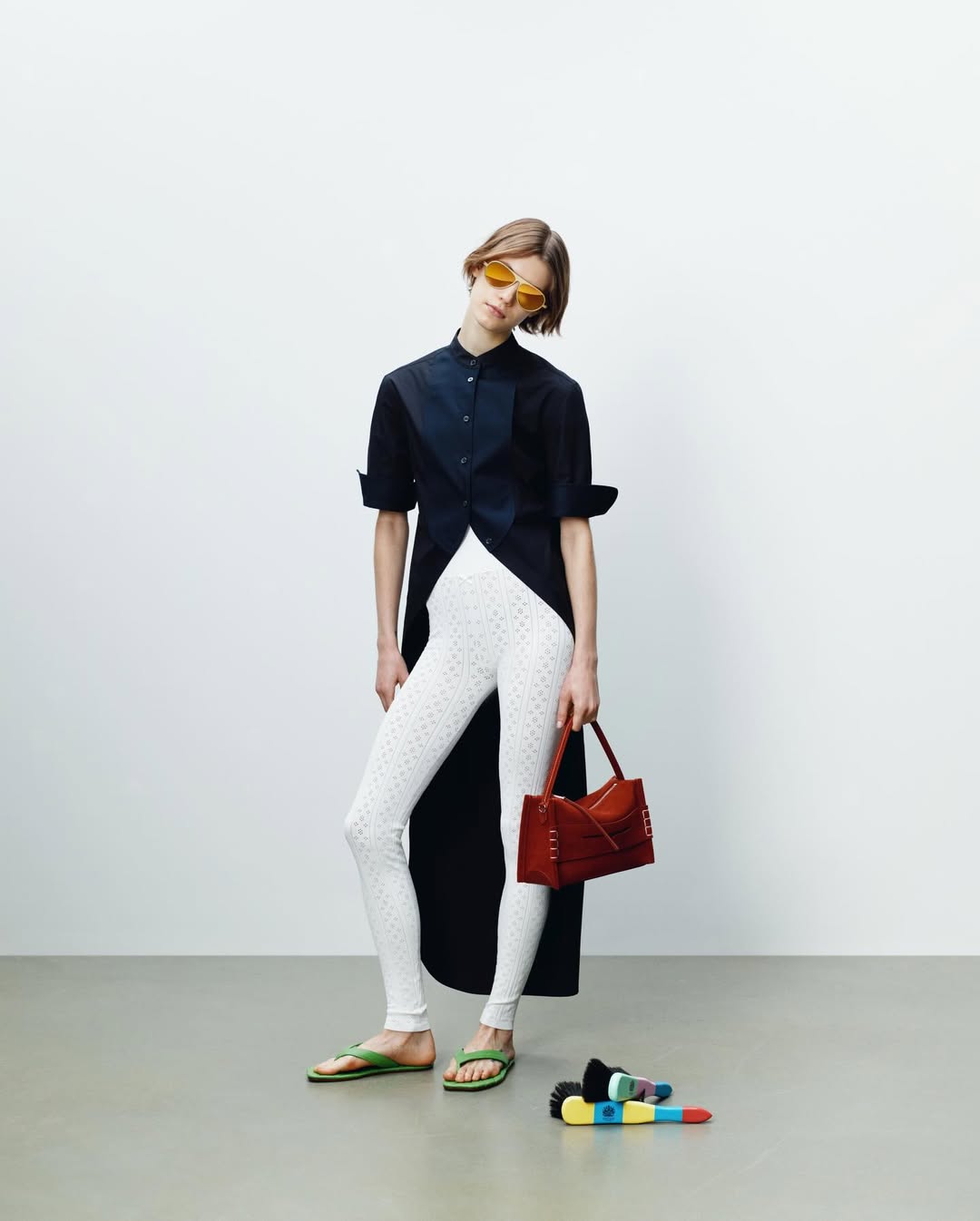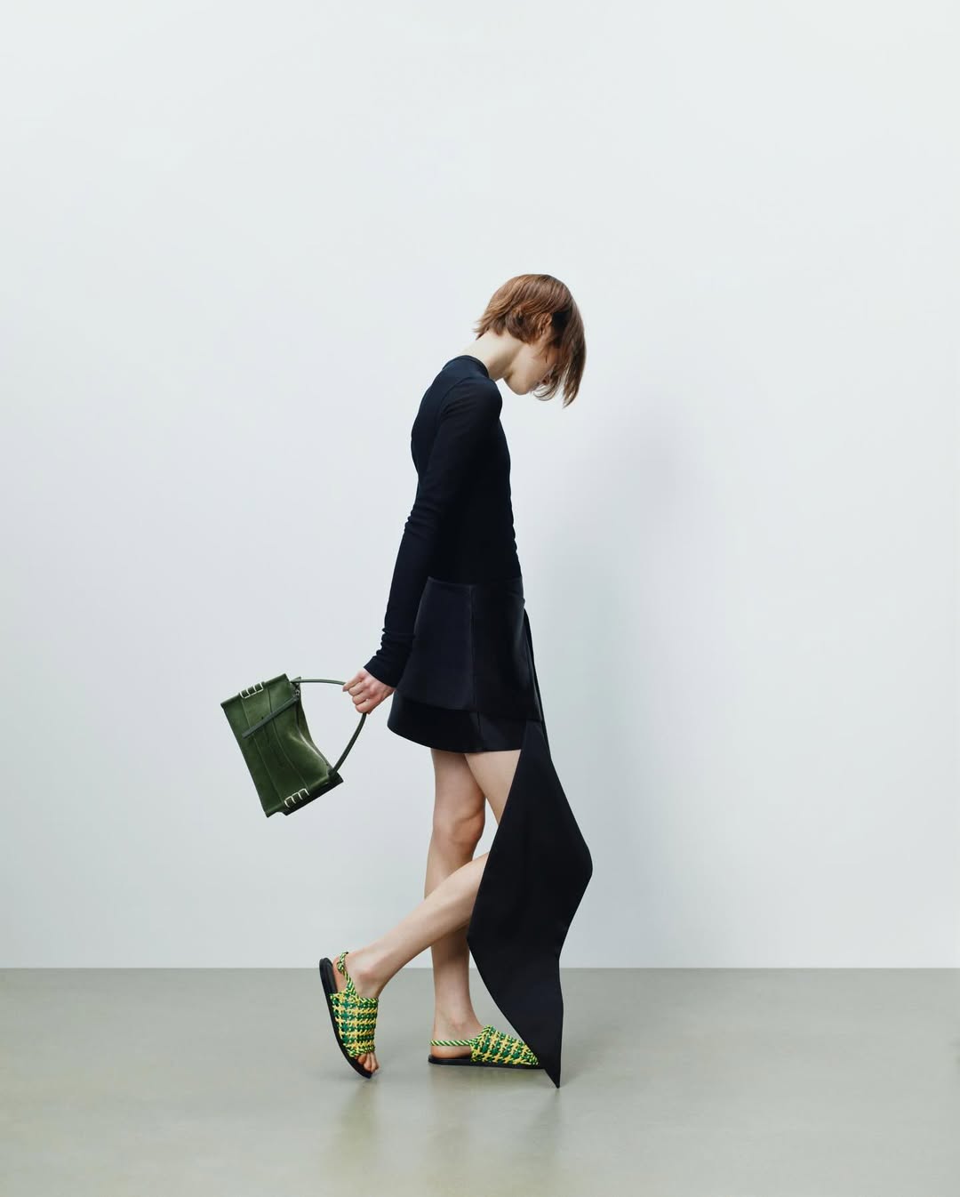 JW ANDERSON标志性的、略显怪诞而充满创意的经典单品——飞行夹克、打结连衣裙、趣味针织,以及“不那么基础”的基础款——都以一种轻快而自然消解性别界限的态度焕新回归。配饰系列亦随之演变:Anchor Tote加入图案处理,而Loafer Bag则以松绿色鳄鱼皮材质呈现全新版本。