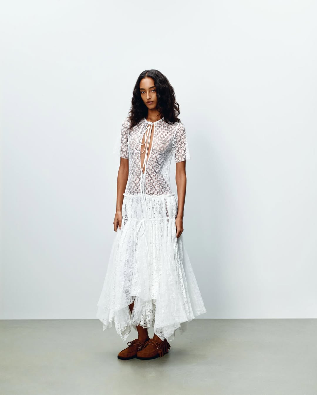 工艺是核心所在。钩针编织以蕾丝与羊毛为材质,运用于半裙与连衣裙之中,从开放而精致的菱格结构,逐渐过渡至更为紧密、更加大胆的花卉造型。垂坠剪裁塑造出戏剧性的体量感。植物图案与人物形象取材自复古印刷品,通过细致的丝网印刷呈现,既尊重其原有形态,也保留了制作质感。