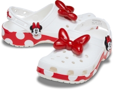 Mickey & Friends经典洞洞鞋呈现多款充满辨识度的角色专属设计。米奇款以代表角色形象的红黑二色为主色调,鞋面点缀有黑白米奇头像;米妮款则以纯白鞋面搭配红色鞋侧,融入代表米妮经典裙装的波点元素,并饰有标志性的立体蝴蝶结。