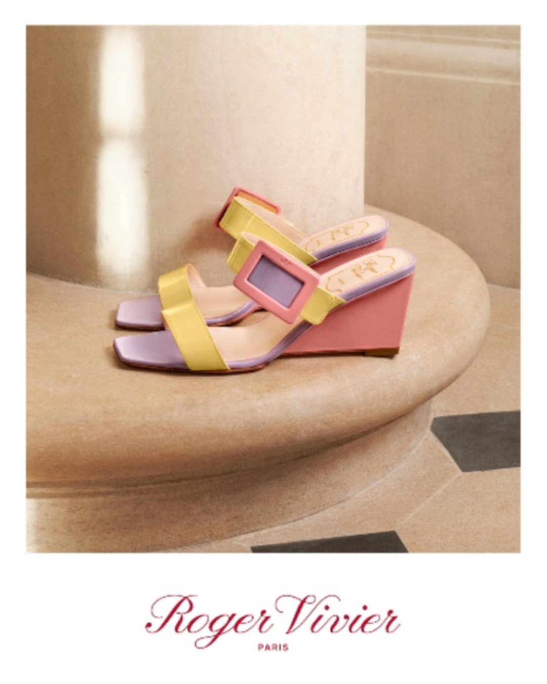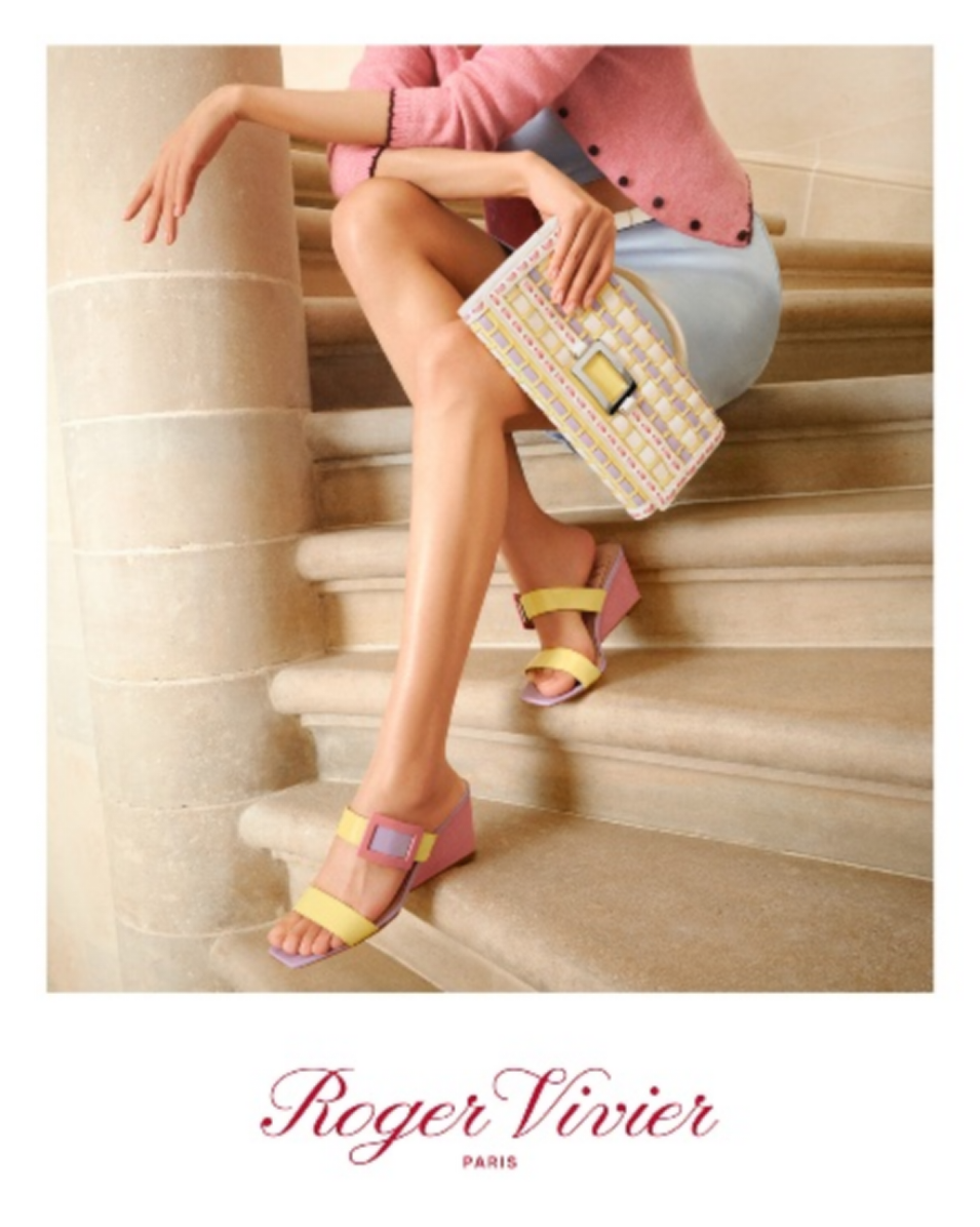 华美诠释之余,ROGER VIVIER 2026 春夏系列广告大片亦为 Belle Vivier 扣饰系列的经典设计赋予新意表达。漆皮坡跟凉鞋撷取明快色彩,缀以标志性Belle Vivier方扣。在本系列灵感情绪板的映衬下,Belle Vivier扣饰手袋成为本季主打包款。乳白色与淡紫色款展露含蓄之美,彩色编织皮革款凸显纹理质感与视觉对比。与此同时,Belle Vivier扣饰露跟凉鞋焕现新颖拼色,重申设计的摩登风范与百搭魅力,令本季叙事更加立体。