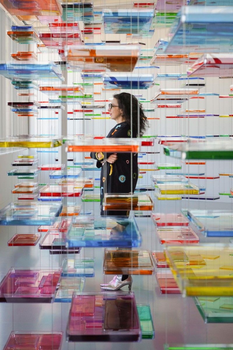 意大利艺术家保拉·皮维以俏皮而富有张力的创作语言著称。她热衷于打破既有语境,通过错位与反差制造视觉悖论。当 Canasta 风衣被寄至她位于夏威夷的住所时,一种强烈的“错位感”油然而生。意大利精裁的防雨风衣,与海岛悠闲氛围之间形成奇妙碰撞。她回忆道,当自己站在车库与卫生间镜前时,窗外葱郁绿意与天窗洒落的空灵光线交织成一道仿佛自肚脐延展的彩虹光谱。由此,“光”成为创作核心。夏威夷几乎每日可见的绚丽彩虹、丰沛植被与自然能量,被转化为风衣正反面垂直排列的多彩条纹,构建出收束于腰部的沙漏廓形。她将这件作品视为一种全新的时尚语汇——融合未来感、时空感与玩趣精神。