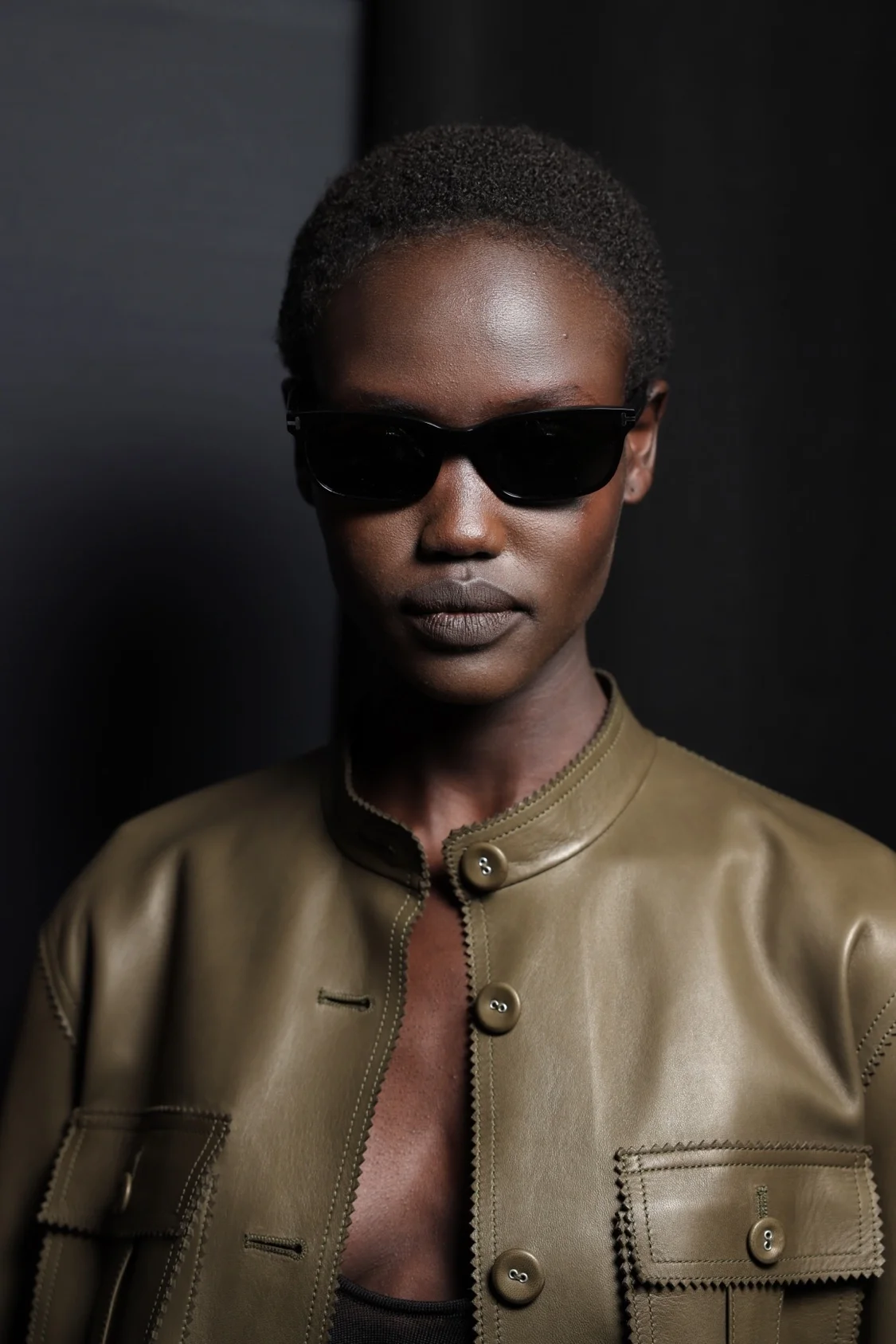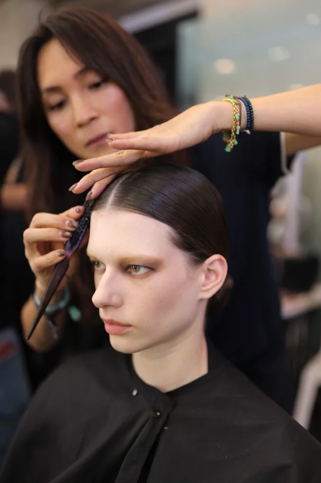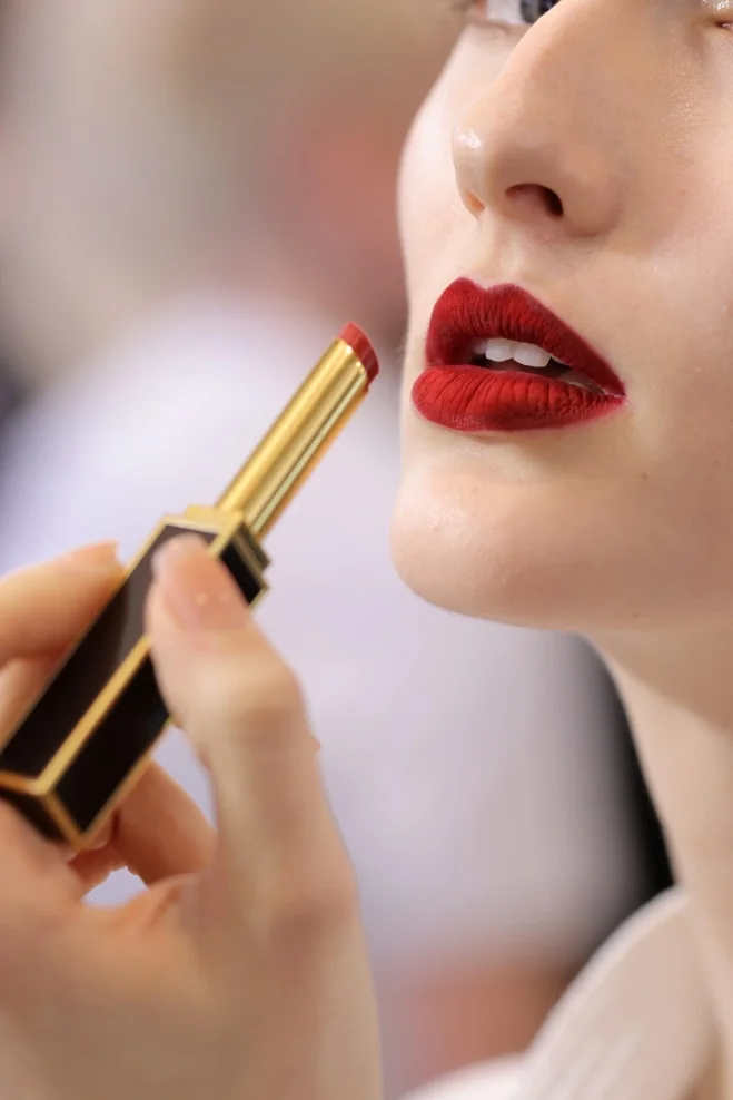 奢华丝绒唇妆,以全新TF「超细管」口红渲染,与烟熏裸感眼妆相得益彰,在全新TF眼部啫喱的包裹下,漫射镜面光泽。模特肌肤散发出健康光泽,雕琢成柔和的面部轮廓,尽显新款柔雾腮红的魅力。本次T台妆容展现出巨大的反差张力:粉雾般的哑光质感与闪亮湿润的光泽相互碰撞,尽释极致之美。