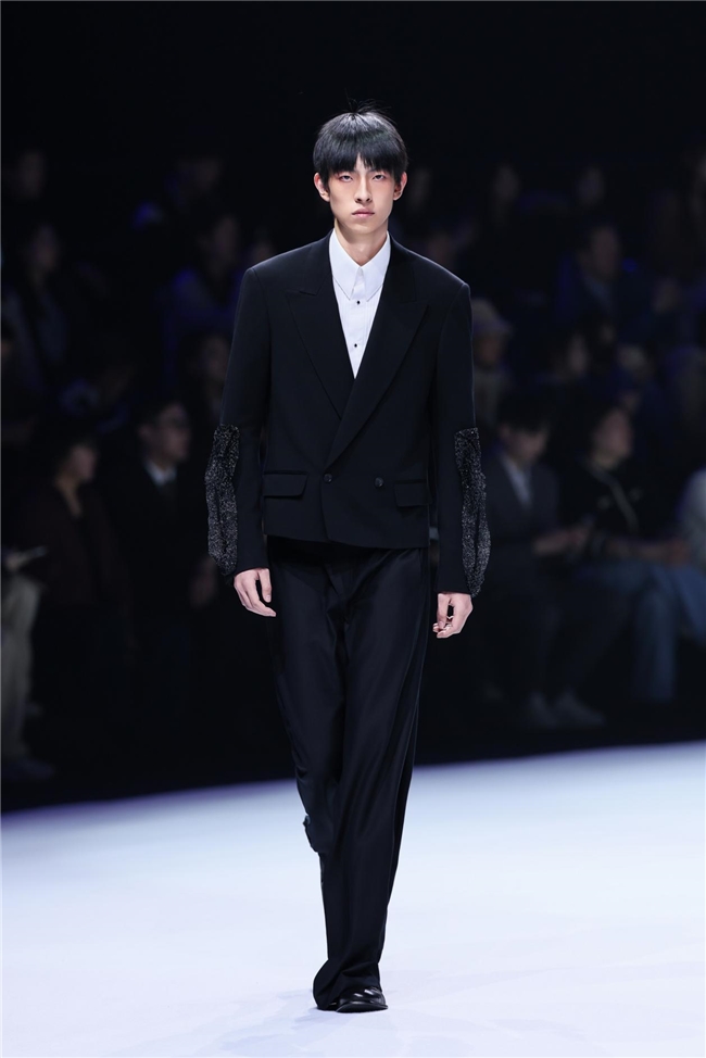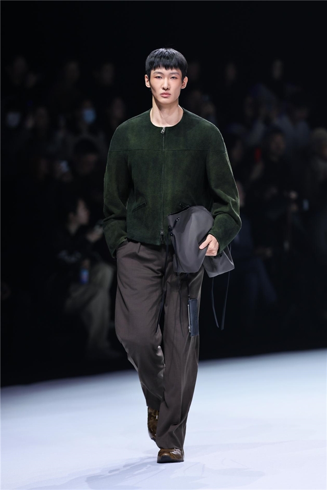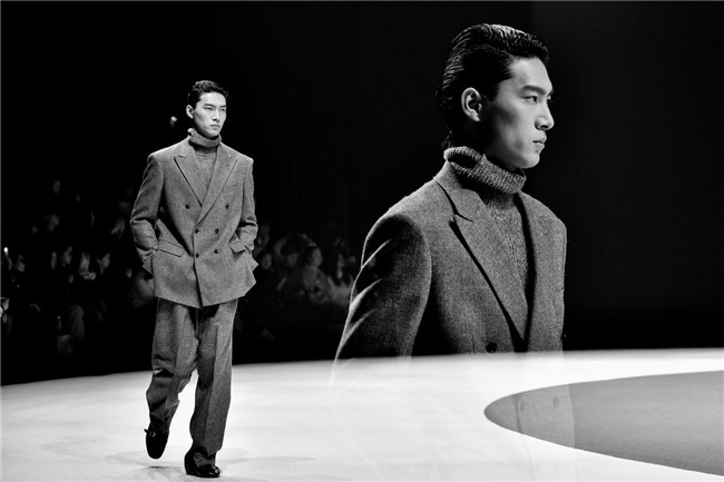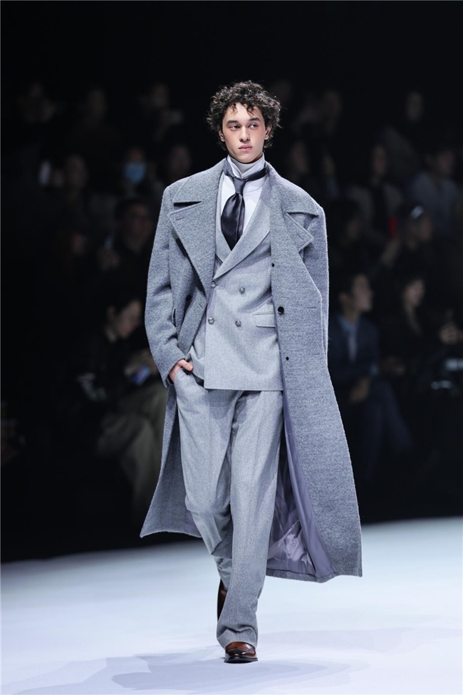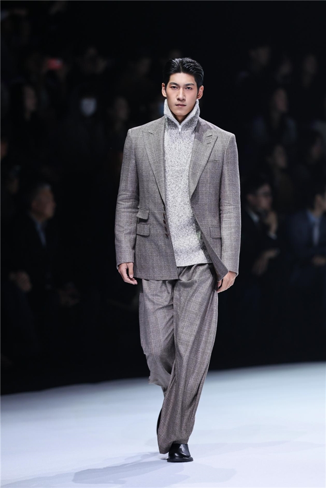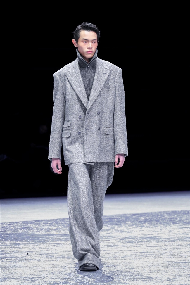 当模特从深处走来,人们看到的是一种回归——回归到服装最本质的表达。这一系列重新定义了当代男性的通勤装,将职场所需的得体与流动的时尚趋势悄然缝合。羊毛的温润与科技面料的挺括在同一件衣物上相遇,经典剪裁被赋予新的生命:肩线利落却不僵硬,廓形简洁却有筋骨。没有冗余的装饰,没有浮夸的张扬,只有经得起时间审视的品质。它们是献给那些相信长期主义的人——一件衣服的价值,不在于一季的流行,而在于五年后、十年后,你依然愿意穿上它,走进任何一场重要会议。
