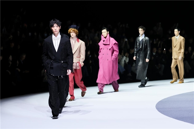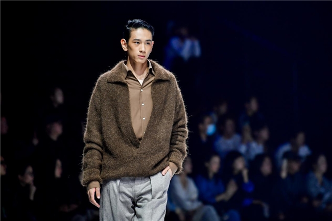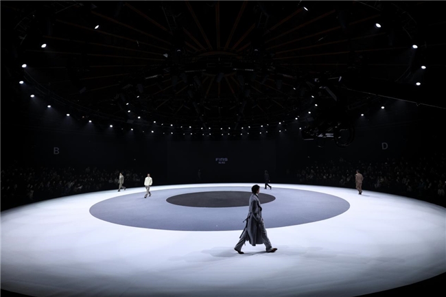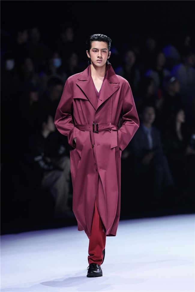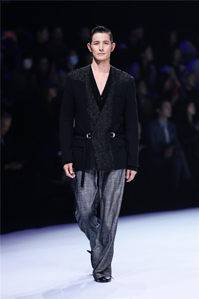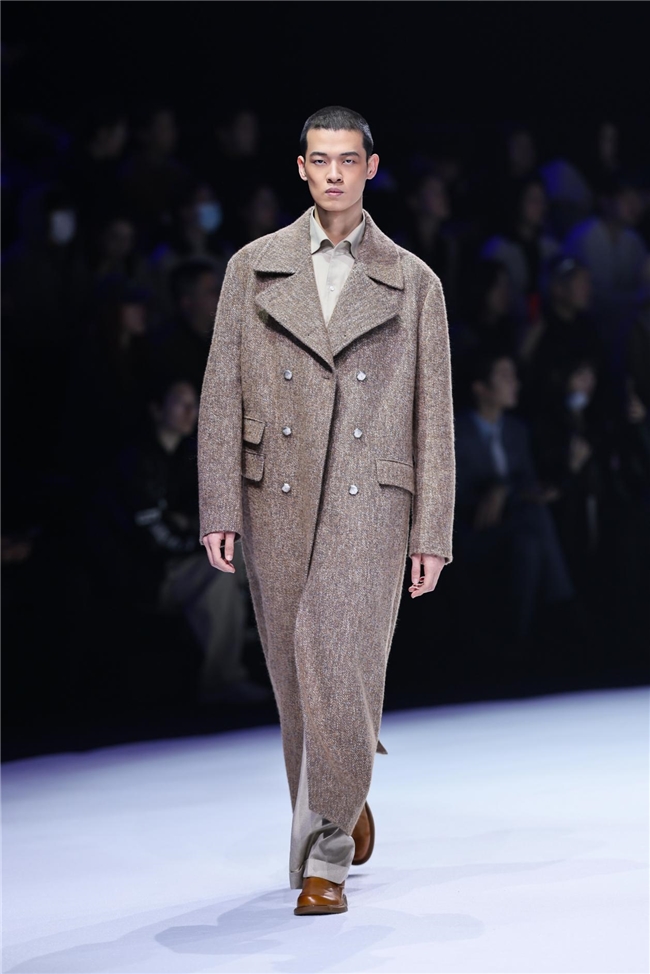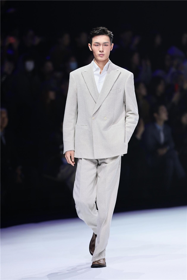当模特从深处走来,人们看到的是一种回归——回归到服装最本质的表达。这一系列重新定义了当代男性的通勤装,将职场所需的得体与流动的时尚趋势悄然缝合。羊毛的温润与科技面料的挺括在同一件衣物上相遇,经典剪裁被赋予新的生命:肩线利落却不僵硬,廓形简洁却有筋骨。没有冗余的装饰,没有浮夸的张扬,只有经得起时间审视的品质。它们是献给那些相信长期主义的人——一件衣服的价值,不在于一季的流行,而在于五年后、十年后,你依然愿意穿上它,走进任何一场重要会议。