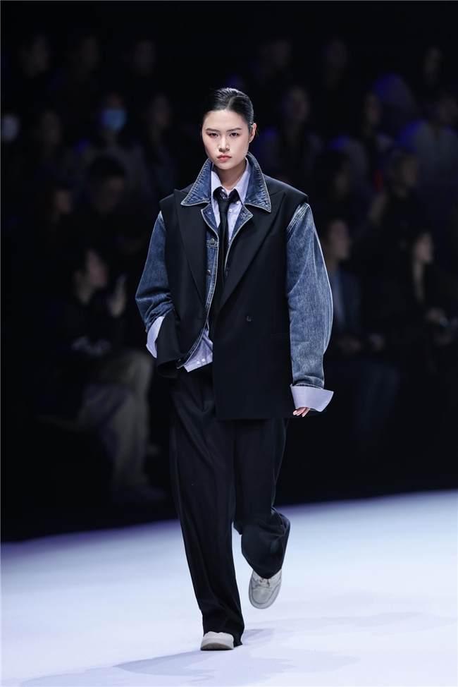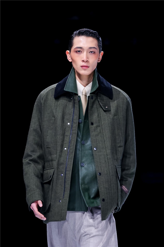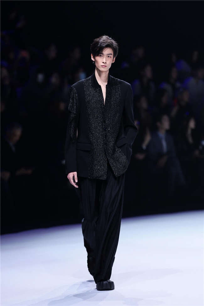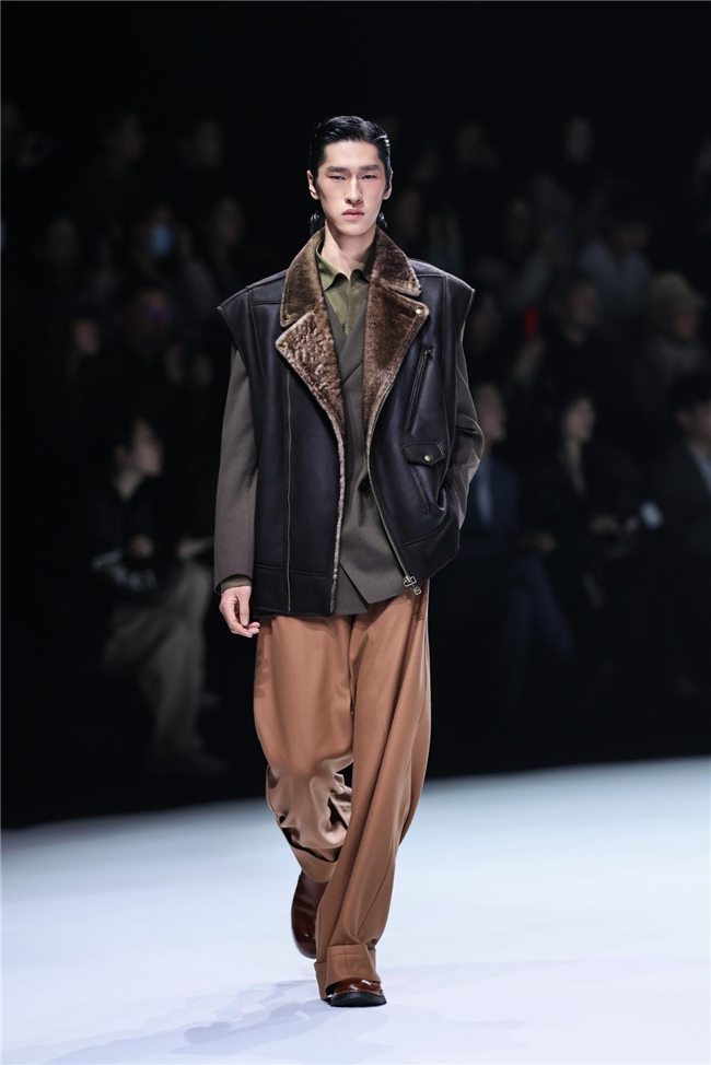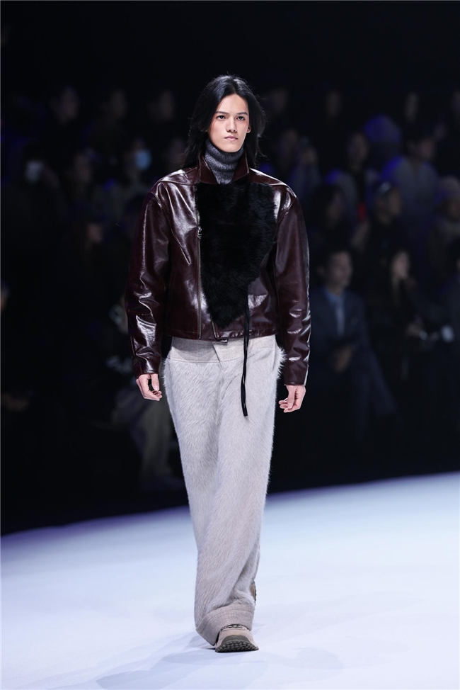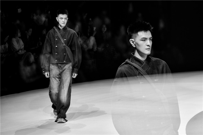 当模特身着慵懒廓形的外套徐徐走出,整个秀场的气息为之一变。那是年轻化的东方美学在说话,自然肌理的面料承载着手工的温度,宽松的剪裁里藏着从容的余量。细看之下,隐约可见民族非遗元素的点缀,不是刻意的符号堆砌,而是被现代设计语言重新解读后的悄然呈现。它们让一件衣服有了故事,有了来处。这一系列是为那些向往“慢生活”的人准备的,穿着它,仿佛随时可以启程,去往山水之间,寻一份内心的静谧。