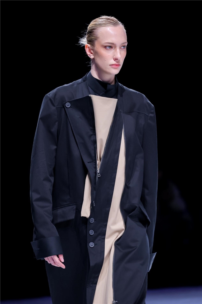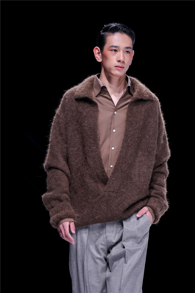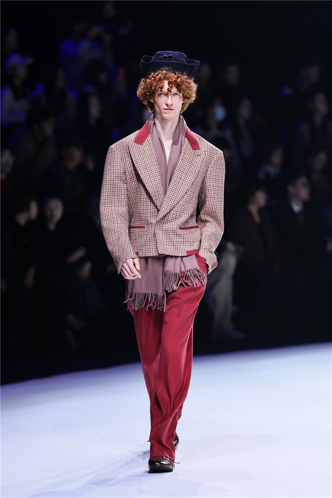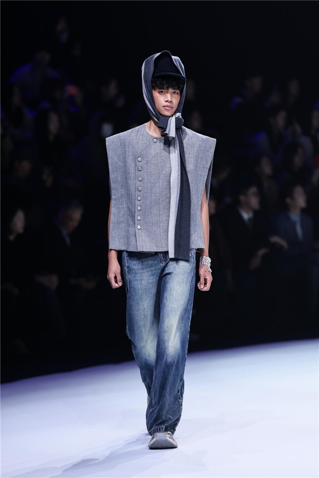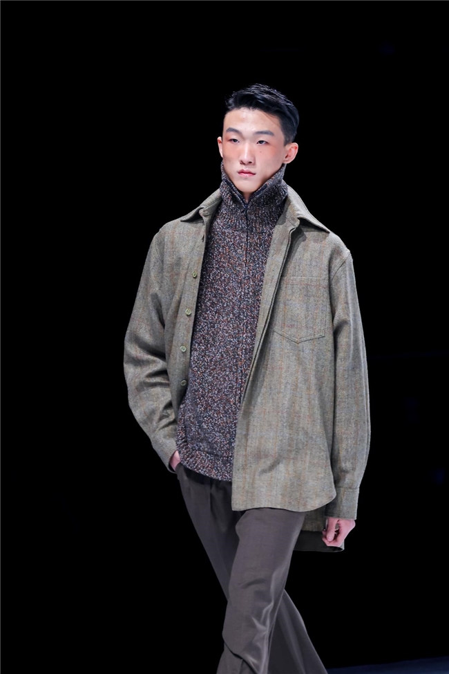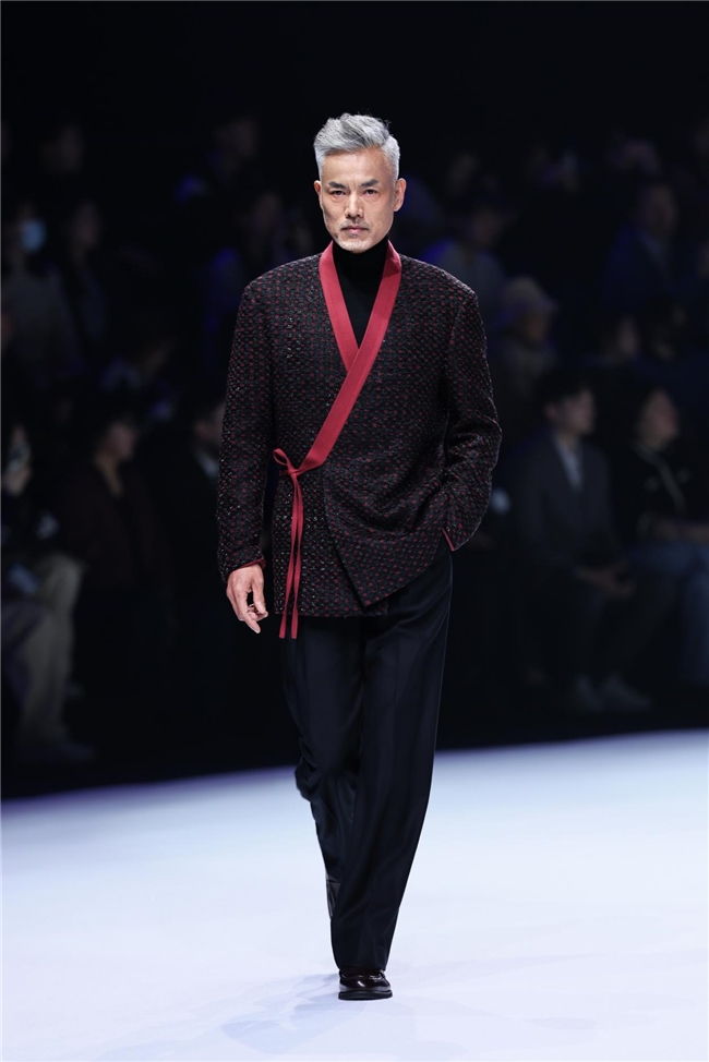 当模特身着慵懒廓形的外套徐徐走出,整个秀场的气息为之一变。那是年轻化的东方美学在说话,自然肌理的面料承载着手工的温度,宽松的剪裁里藏着从容的余量。细看之下,隐约可见民族非遗元素的点缀,不是刻意的符号堆砌,而是被现代设计语言重新解读后的悄然呈现。它们让一件衣服有了故事,有了来处。这一系列是为那些向往“慢生活”的人准备的,穿着它,仿佛随时可以启程,去往山水之间,寻一份内心的静谧。