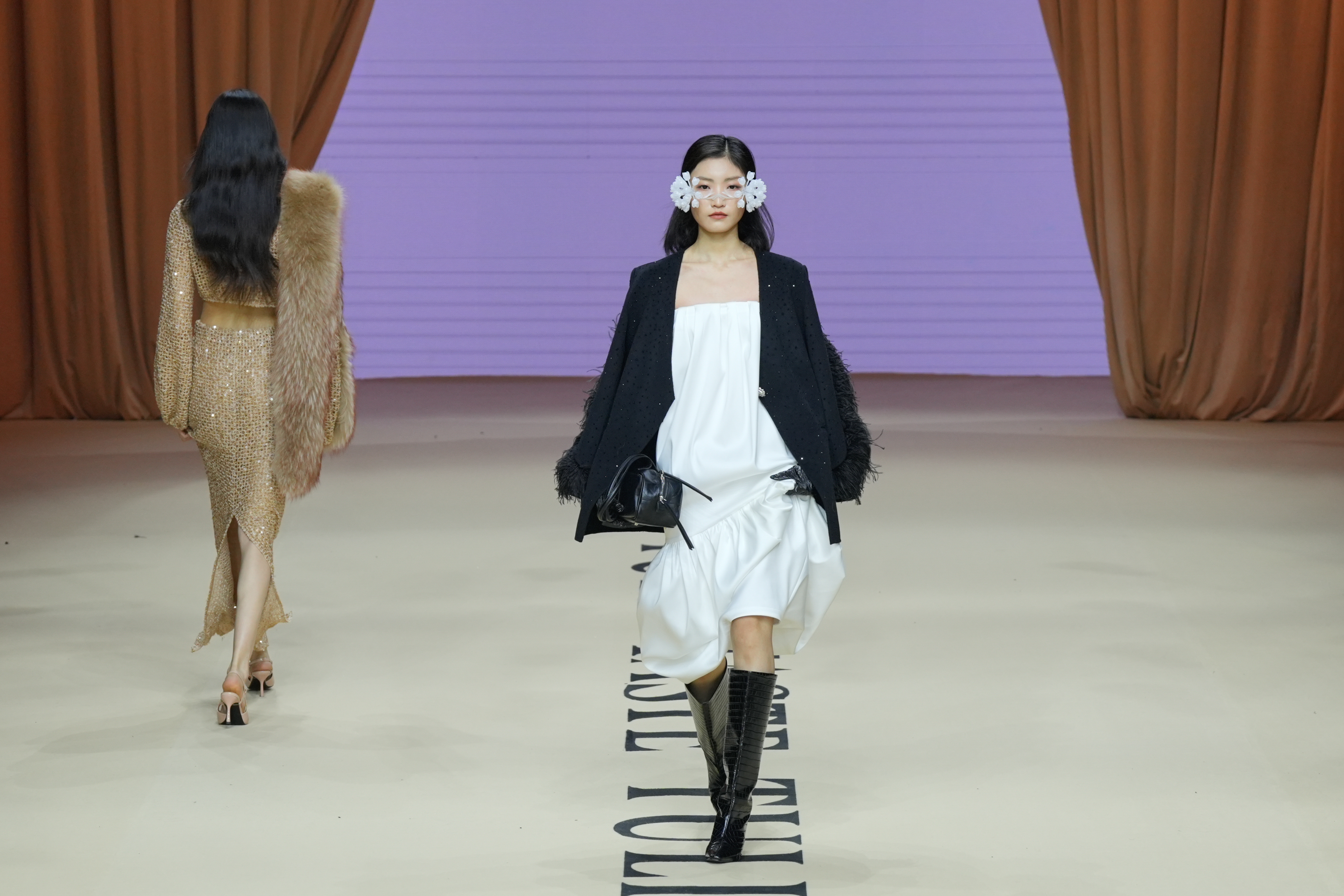 Y2FREEDOM品牌设计师胡莹莹以高端皮草面料设计,通过松弛廓形搭配利落剪裁,兼顾穿着温度与身心舒适,为高知女性打造兼具艺术感与实穿性的先锋着装;嘉兴南湖学院时尚设计学院带来产教融合师生作品发布会“界·境”,师生共创,打破皮革、皮草、织锦的技艺界限。熙颜XIYAN品牌设计师周雨君以“云和泥”演绎东方美学,将香云纱非遗工艺化作时尚华服;来自海宁市许村镇的设计师贺荣以“驰光”为主题,将传统织锦与现代设计创新融合,带去多款融入马元素的马面裙作品,让千年织锦在当代T台上焕发新生。郁香菲品牌主理人王佳华专注知性女性赛道,打造了具有文化温度与风格高度的现代女装新样板。