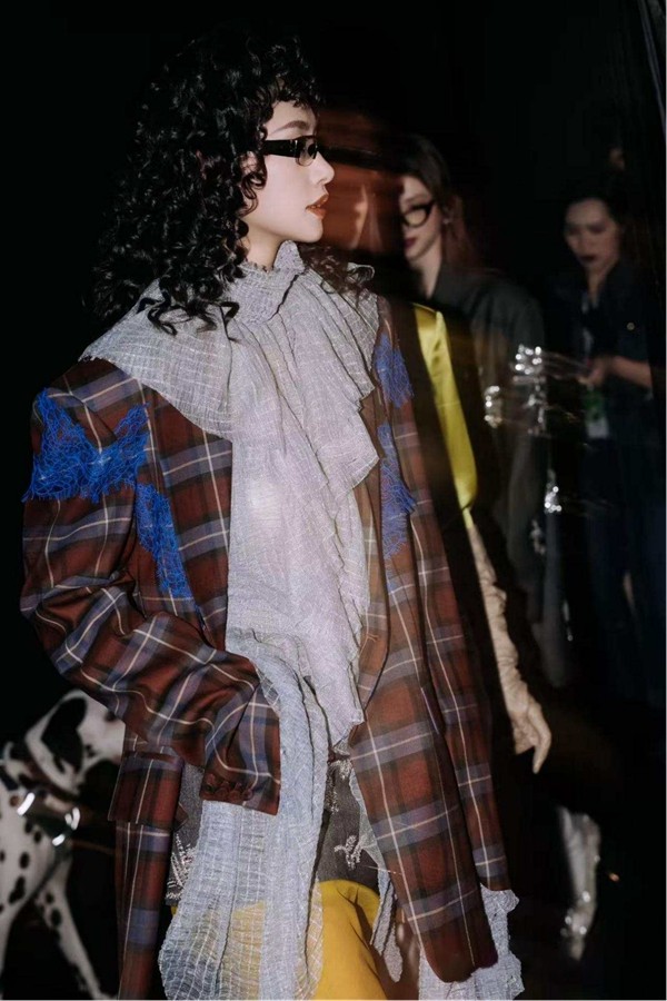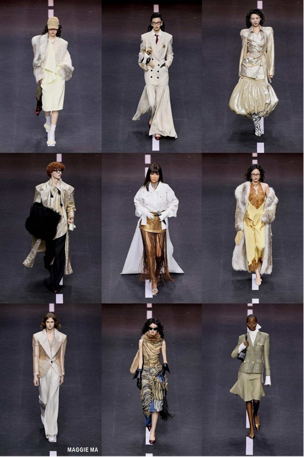 MAGGIE MA本季核心采用复古混纺金银丝线,呈现颗粒感与微闪光泽,搭配哑光亮面皮革、轻透蕾丝、精纺格纹羊毛、柔滑植绒缎面与轻盈真丝乔其纱,通过材质碰撞塑造层次,运用经典格纹、牛仔、精致花卉刺绣与简约纯色肌理,既延续经典质感,又契合2026年环保与复古并重的面料趋势。