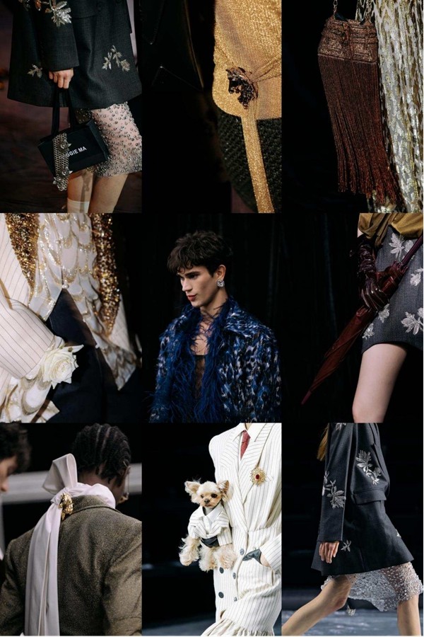 创新融合手工钉珠刺绣、立体荷叶边、灵动流苏与不对称剪裁,赋予服装层次与动感;色彩以深灰、焦糖棕为基底,用宝蓝蕾丝与金葱细节提亮质感;面料精选精纺羊毛、丝滑醋酸与金属丝混纺,在优雅与锋芒间取得平衡,致敬每一份独特、每一种自我,让每一份不被定义的存在,都成为非均质的璀璨光芒。