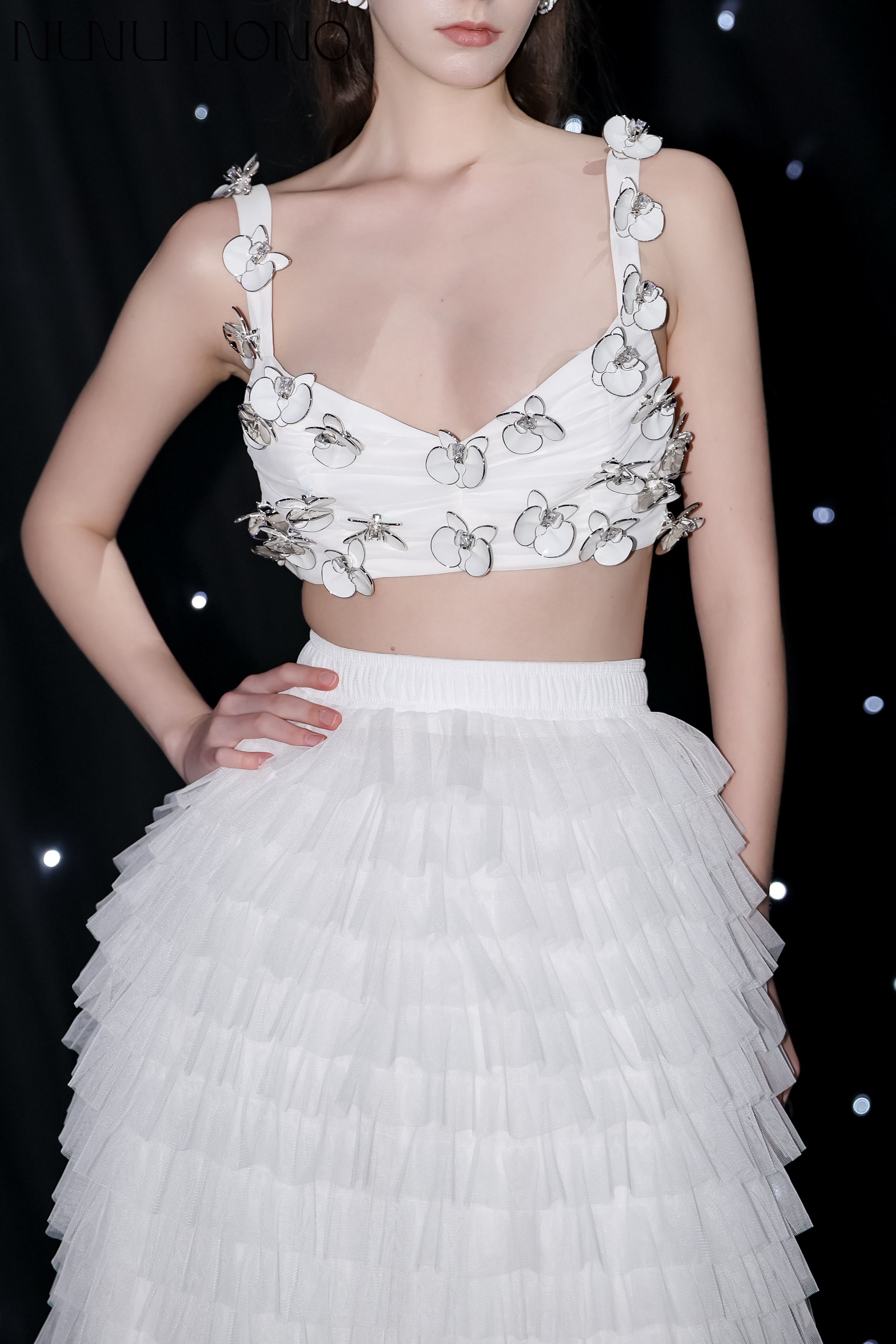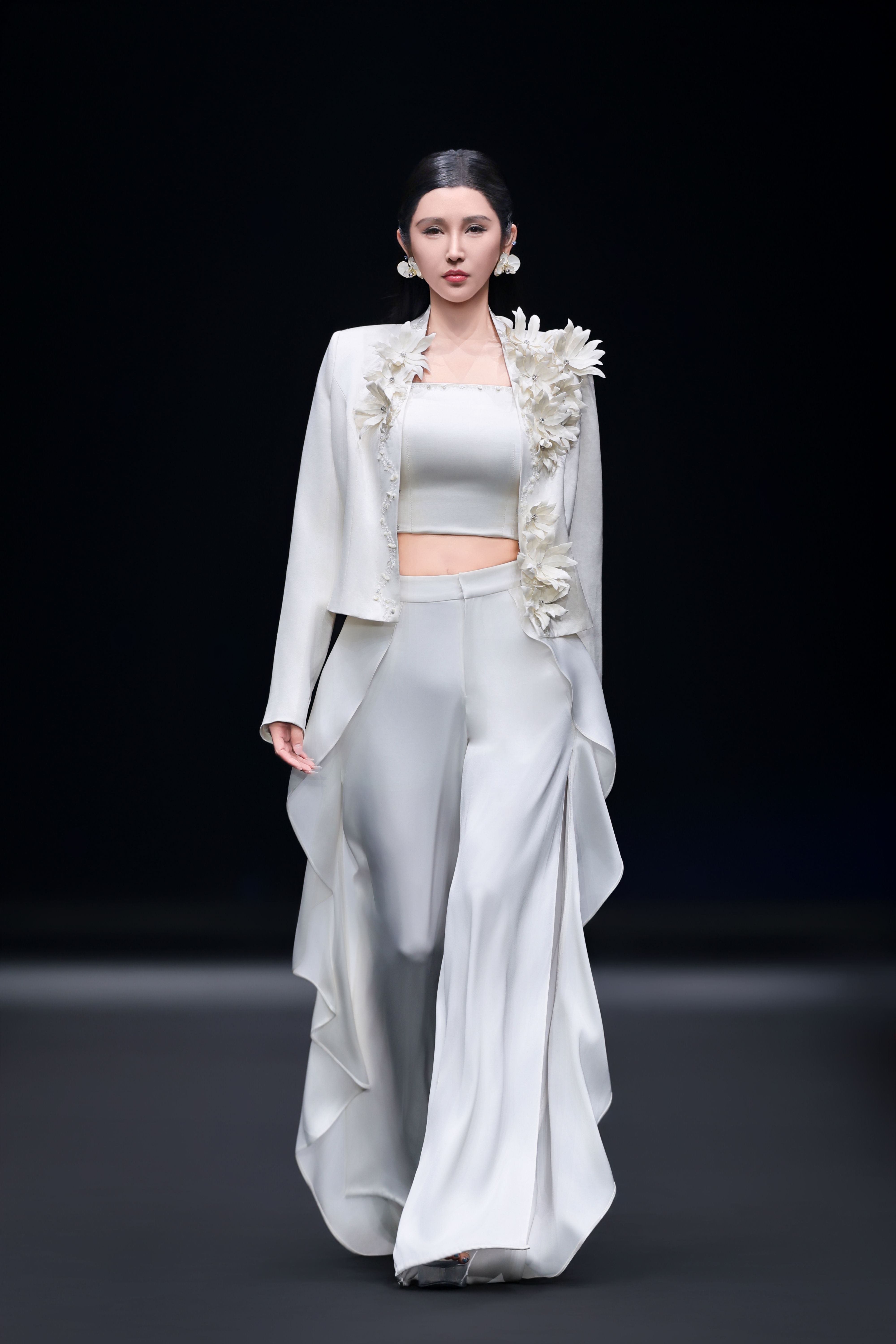 本系列的每一件作品,都在回应同一个问题:如何让穿着者感受到“吾心即是宇宙”?NUNU NONO的答案是——通过服装的结构、工艺、色彩,去创造一个“可穿着的哲学文本”。工艺不再是单纯的装饰,而成为宇宙叙事的语法。它们与手工叠纱的透叠感、立体压褶的放射状肌理、手工布花的层次结构共同作用,将法国高级时装技法融入具有东方哲思的当代造型之中,于方寸衣料间实现东西方美学的对话。