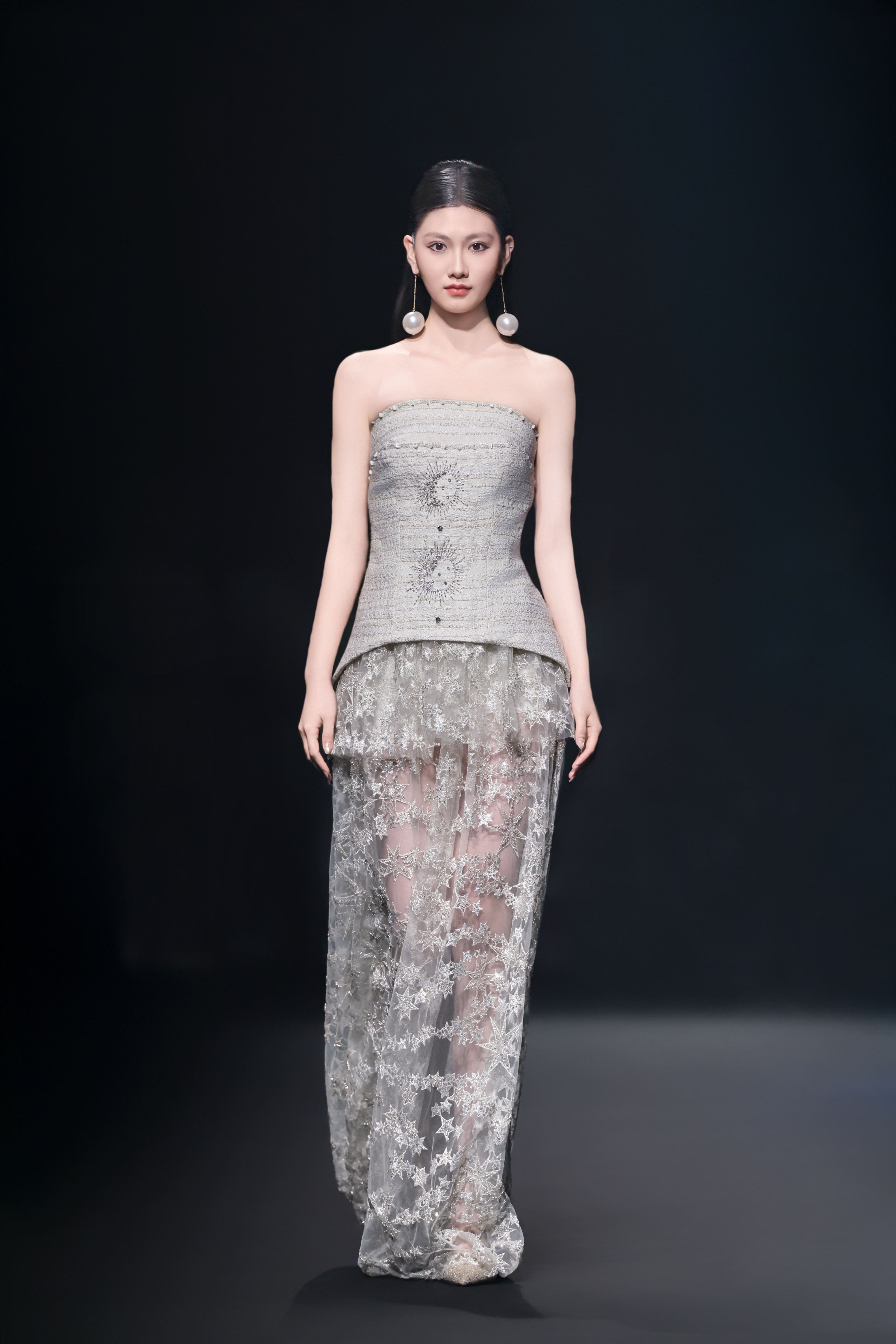 四五十亿年前,所有人来自同一颗星星。我们身体里的每一颗原子,都曾是那颗恒星的一部分。所谓“缘起”,是粒子的重逢;所谓“星辰”,不在天上,而在我们体内。以此为灵感,设计师从银河的流动、星光的微芒中捕捉形态与情绪。模拟银河肌理的面料为底,苏绣、法绣、珠绣、锁链绣、手工叠纱、立体压褶、手工布花等精巧工艺交织其上,点繁星之象。如星河倾泻的廓形之下,“把银河放入手心”的浪漫,具象为可穿戴的艺术。