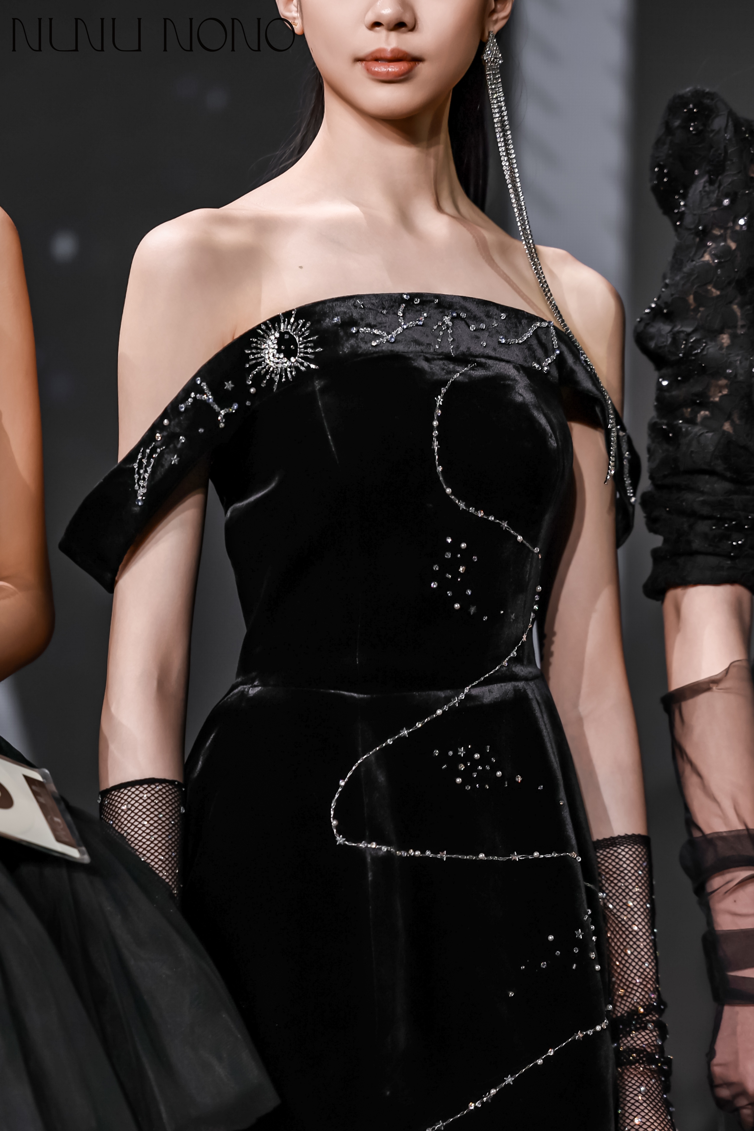设计师在本系列中同时运用苏绣、法绣、珠绣、锁链绣四种工艺——苏绣用丝线表现星云的“气韵”;法绣用亮片珠管勾勒星体的“光芒”;锁链绣以连绵线条描摹星轨的“路径”;珠绣用大小珠管排列星点的“疏密”。四种工艺各司其职,共同完成“宇宙演化”的叙事。