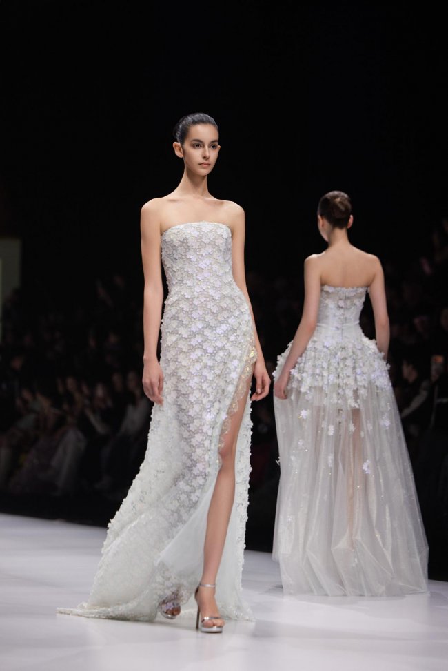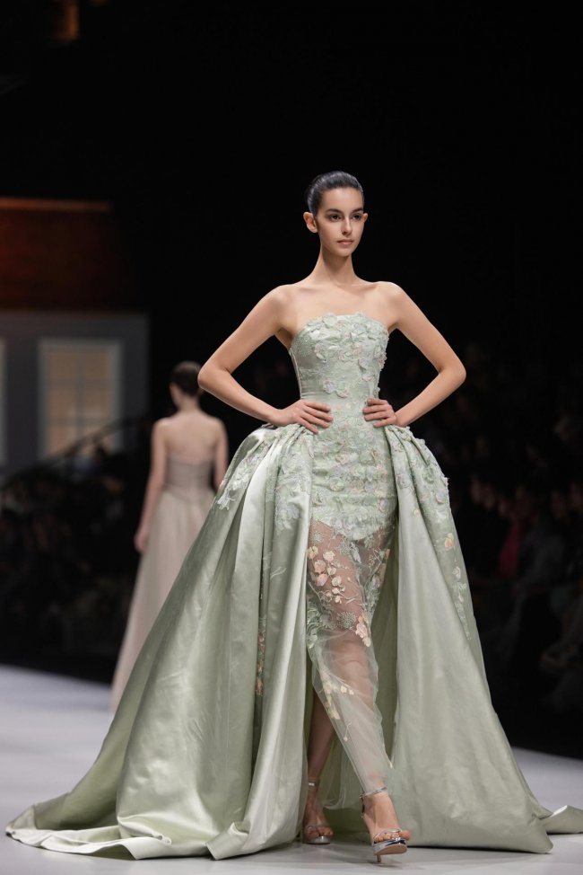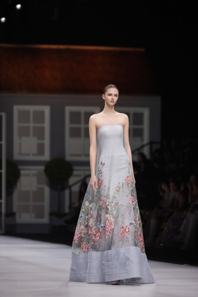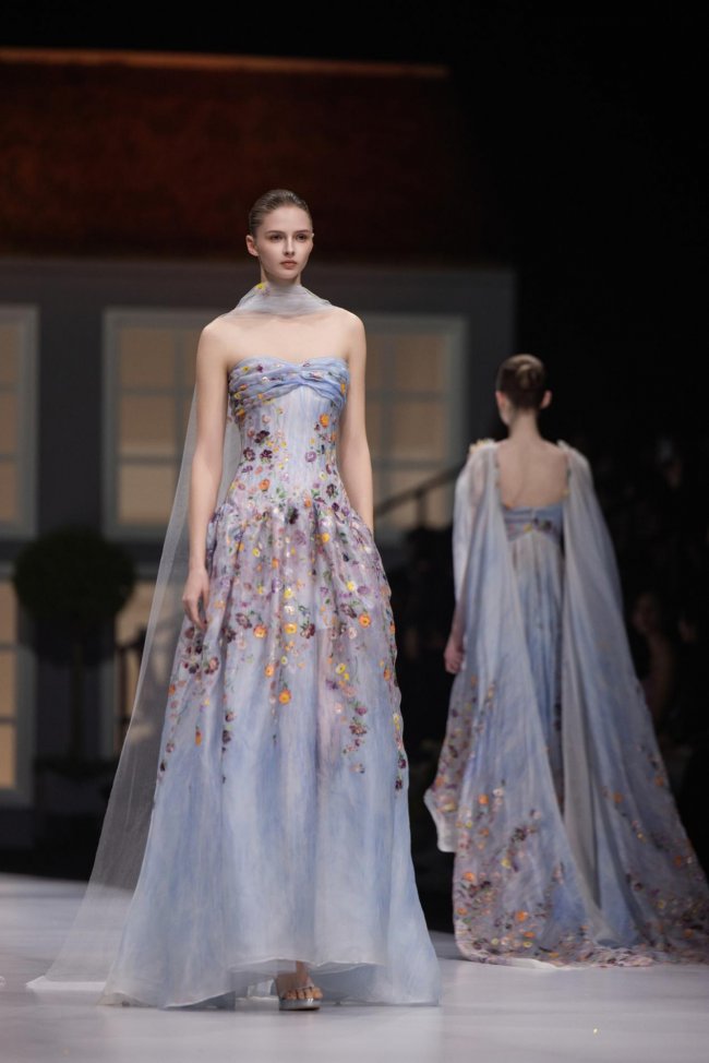 本季系列将微观的精致放大至现实的秀场之中,以女孩的成长心事为脉络,将藏于玩具屋中的美好向往,化作一针一线的高定诗意。女孩幼时憧憬一间属于自己的小屋,安放心爱衣裳与烂漫幻想;长大之后,以华服筑造心灵居所,盛放对生活与美的全部热忱。礼服之上,繁花皆为纯手工彩绘,笔触细腻灵动,色彩温润雅致,宛若将玩具屋里珍藏的春日花园,妥帖安放于衣袂之间。轻盈薄纱与挺括缎面温柔相拥,古典廓形与现代剪裁交织成诗,让童年对美的初心,在岁月深处静静生长、优雅绽放。