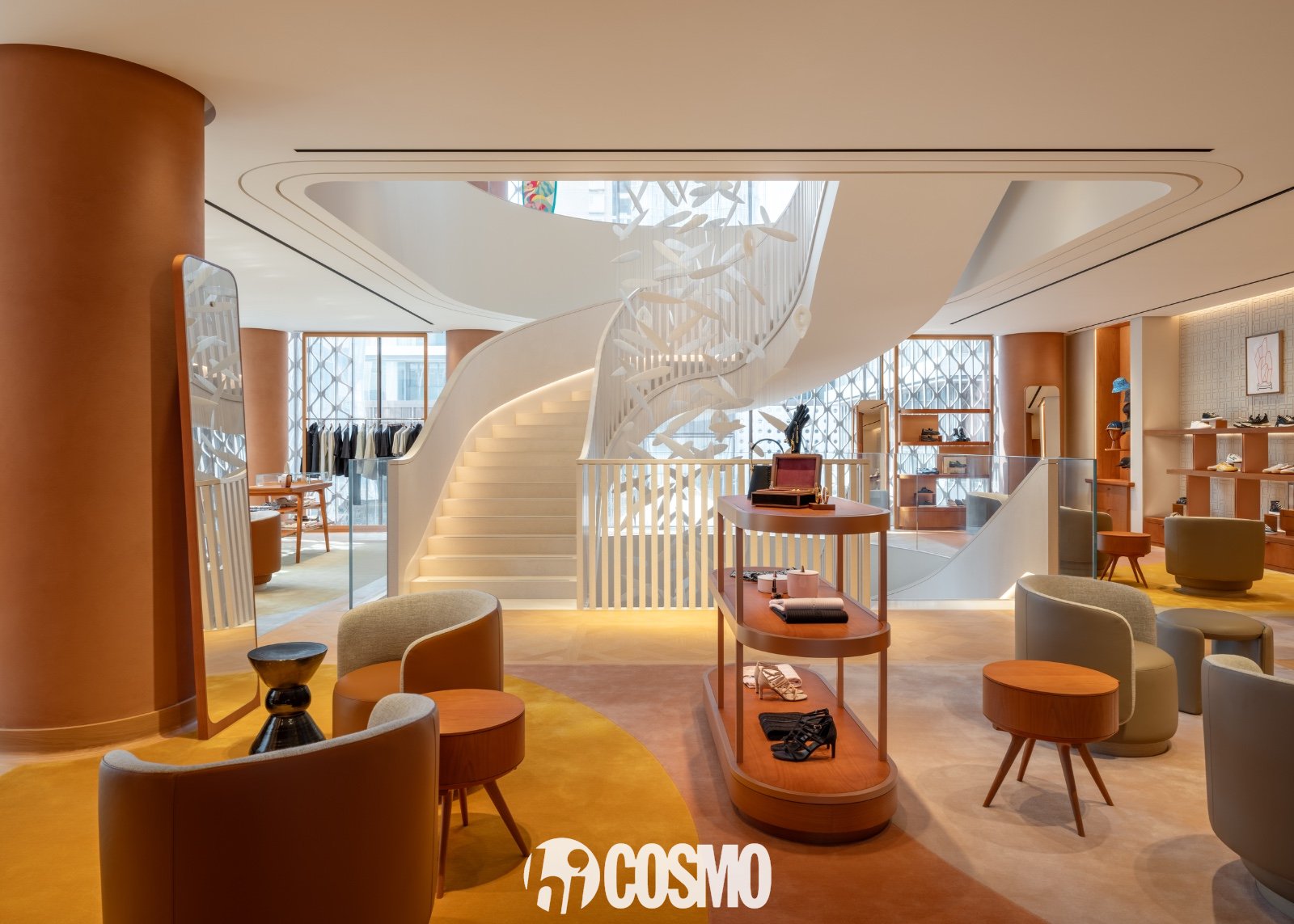 室内空间布局开阔,其间设计纹样承袭跃动于立面的拱形与织纹图案,中央一座宏伟石质楼梯盘旋而上。地下一层设有两处入口,以爱马仕标志性藏书章装点,自然开启探访之旅:鞋履与丝织品区域率先映入眼帘,其后则构筑出开阔的香水与美妆区域。