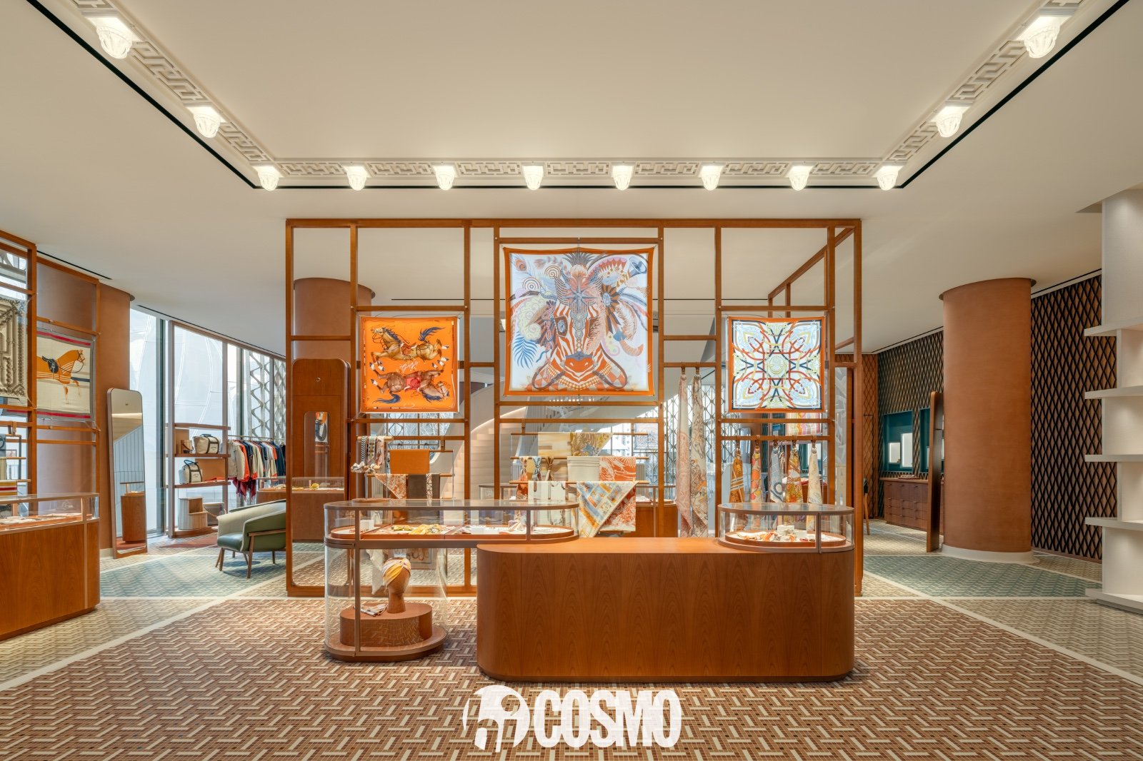 一层空间如明净画卷般铺展:活力丝织品世界与马术系列、时尚配饰系列共处其间,与灵感源自福宝大道总店的彩色马赛克拼接地板相映成趣。上至二层,女士与男士成衣区域紧邻宽敞的鞋履陈列区、温馨试衣间及专属贵宾室。三层空间内,不同木材拼镶而成的墙面、牡丹雕纹漆面墙面与以“H”形排列的陶瓷砖墙相互交汇,陈列家居系列、皮具、腕表及珠宝。作为开阔的专属贵宾室,顶层空间延伸至绿意盎然的景观露台。
