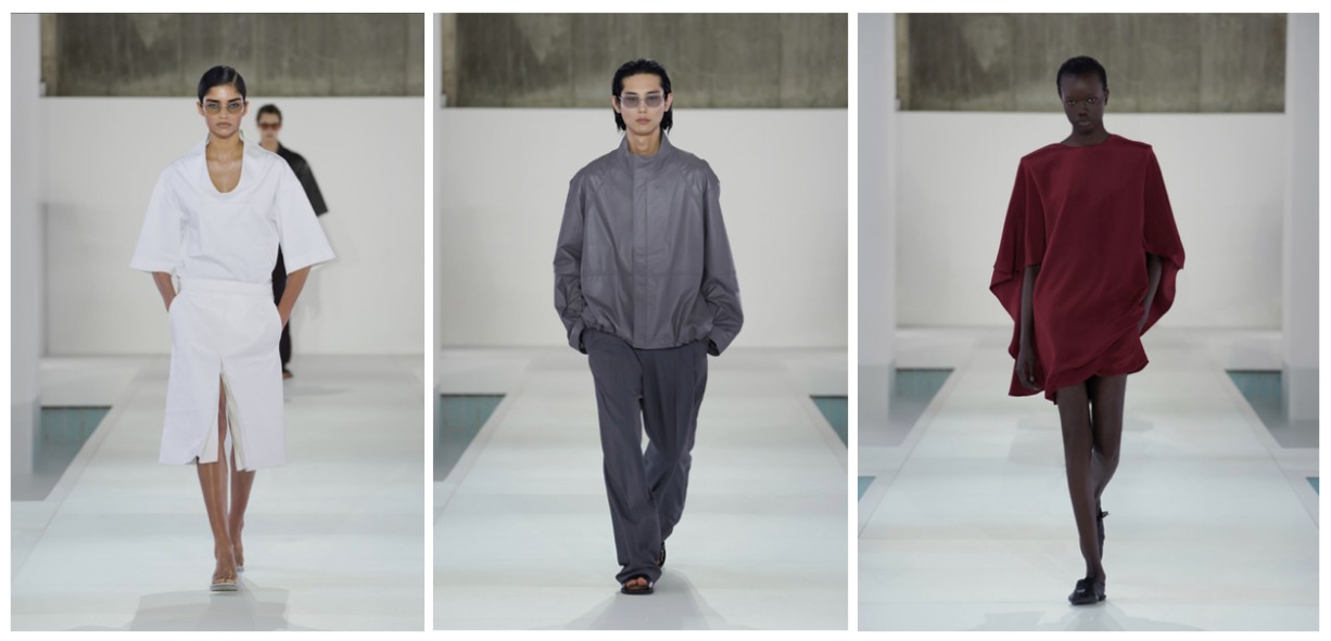 女装部分,以 90 年代极简风格为灵感,使廓形更加清晰,通过细腻的半透明罗纹针织柔化线条的硬度,体现于连衣裙和套装中;利落有力的肩部结构呼应 80 年代的力量感着装。品牌标志性剪裁以更具流动感的面料重新演绎,而以丝绸呈现的“视觉错视丹宁(trompe l’oeil denim)”则为套装造型带来新的表达方式。丝绸元素贯穿整个系列,在工坊中通过柔和褶裥处理,打造出露肩礼服造型,并延展至标志性衬衫设计,呈现出兼具精准与松弛感的风格。抓褶造型通过立体裁剪呈现柔和轮廓;过度型外套则从比例与雕塑感长度出发重新构思,在古典与现代、创新与艺术之间形成张力。整体搭配包括柔软皮革运动鞋、带有建筑感鞋跟的穆勒鞋,以及与服装材质呼应的包袋。