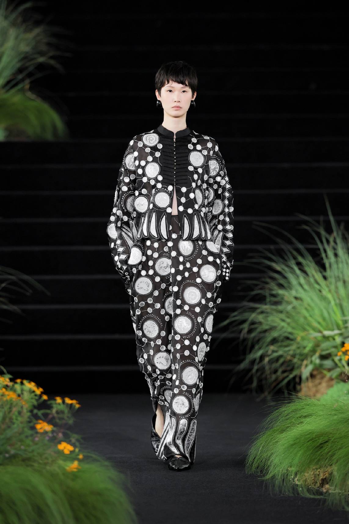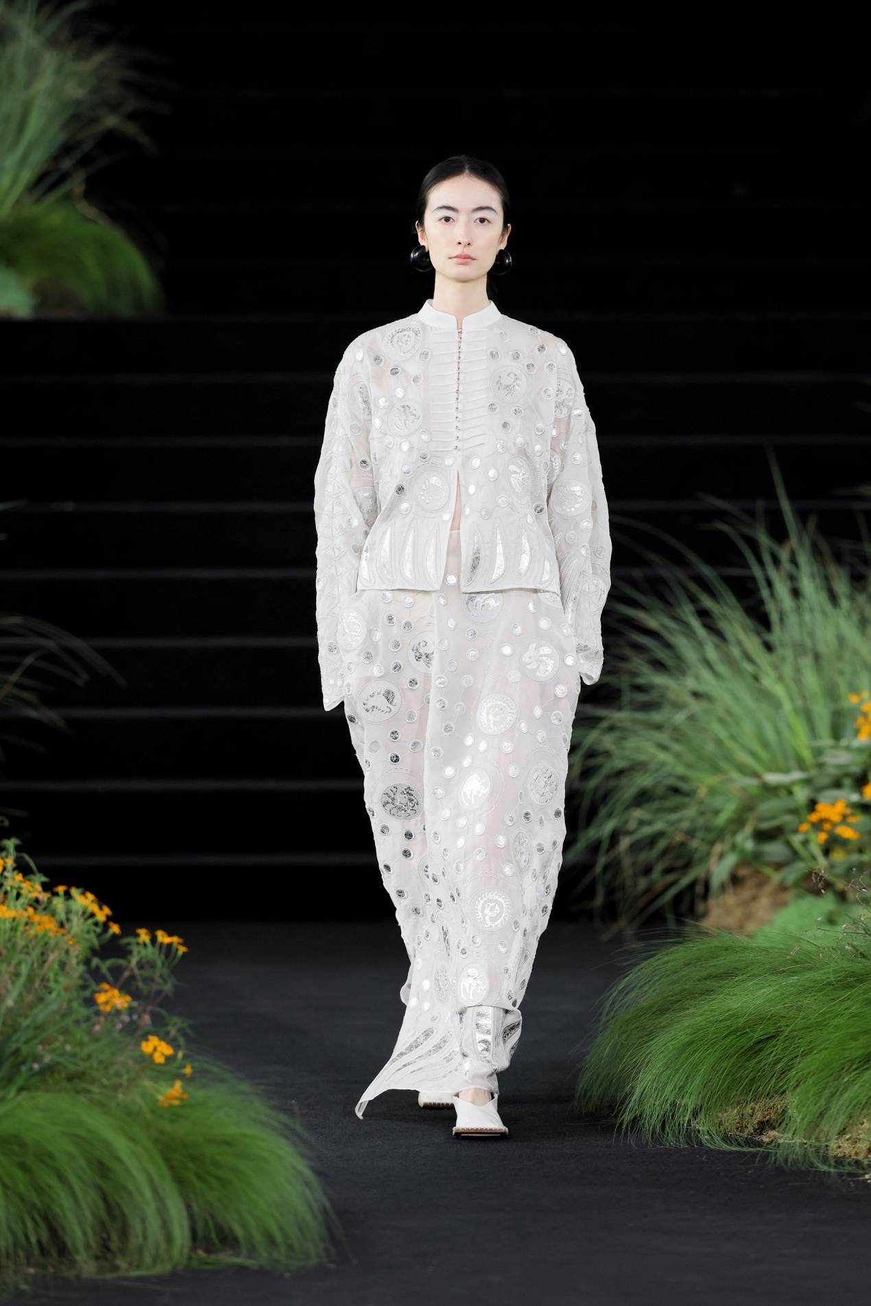 苗系列也在这一篇章出现,共庆生灵之美。黑色真丝欧根纱上,圆形银色贴布内含精细刺绣,图案来自苗族古歌。传说蝴蝶妈妈与“水泡”游方相恋,生下了十二圣灵,它们便是刺绣的主角。光线照耀下,生灵图案的反光强于贴布本身,仿佛在一个个圆形的孕育下随时就要诞生,饱含万物伊始生机勃勃的张力。