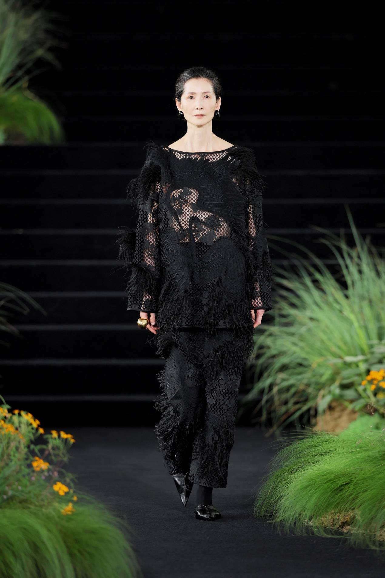 第32套的苗系列蕾丝羽毛刺绣异曲同工。这条连衣裙以复杂的繁荣花草蕾丝面料为底,复合多种绣法刺绣,勾勒出万物欢腾中的神鸟形象。其中刺绣与水溶方式经过反复试验,才让面料在多层刺绣之下依然保持柔软轻盈。羽毛的介入增加了立体层次,让衣装随行走灵动翻飞。但这一切都隐于黑色之中。而这种手法本身就是东方智慧的当代表达,拒绝第一眼的直白,邀请观者进入慢下来的凝视。