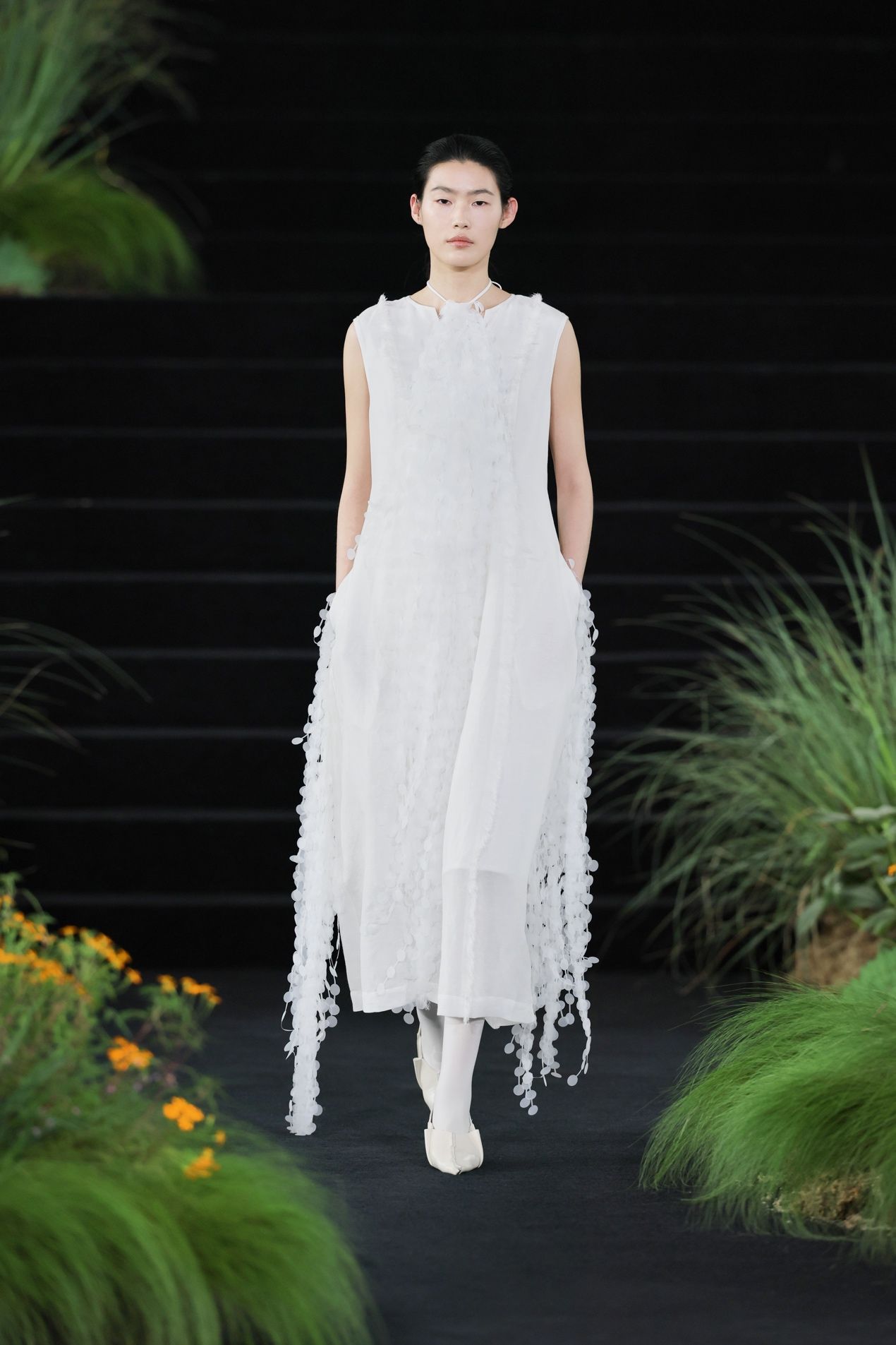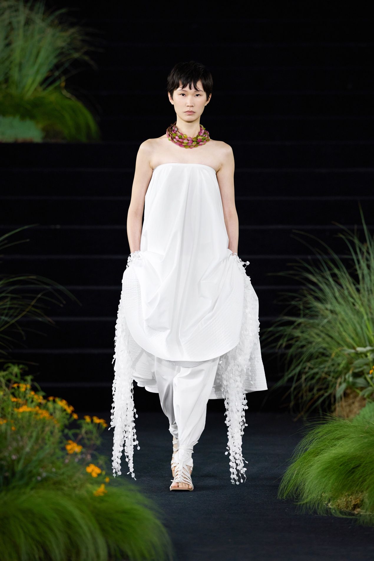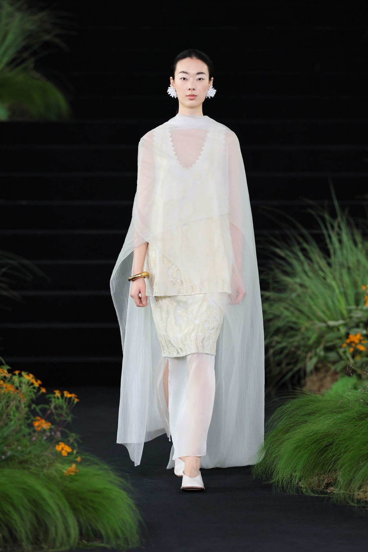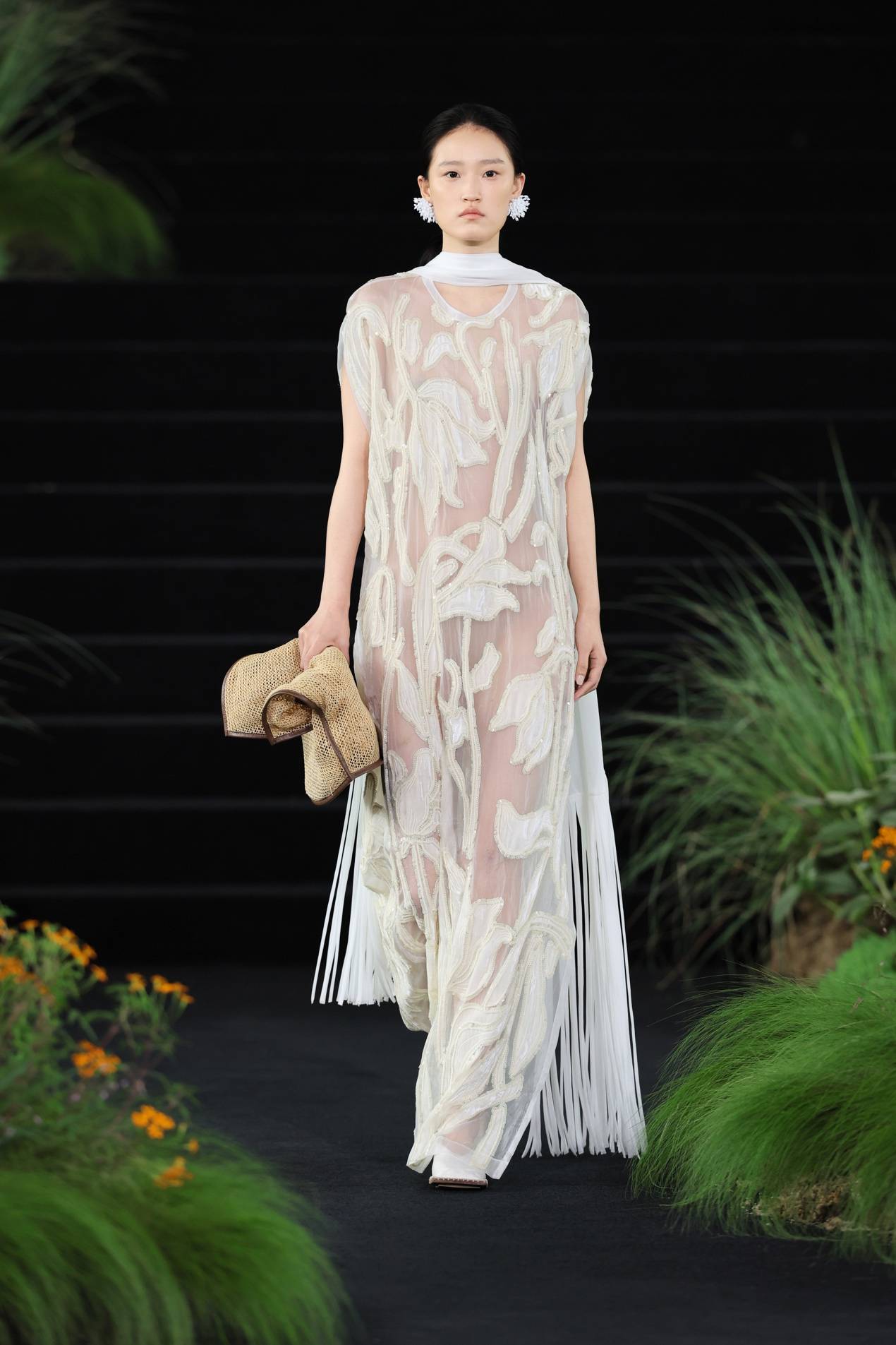 第11套的白色裙装,实则包含四种材质:一层欧根纱底布,一层丝绒,丝绒边缘有立体线,并有珠片围绕。当四者共同组成图案,每一块图形的对位都需要极为考究,刺绣的细腻程度亦要求严苛。然而这种复杂被有意隐藏,不仅四种材质选择了相近颜色,远观未必能见细节;在秀场造型中,重工绣片之外再蒙一层薄纱,一切更落在可见与不可见之间。