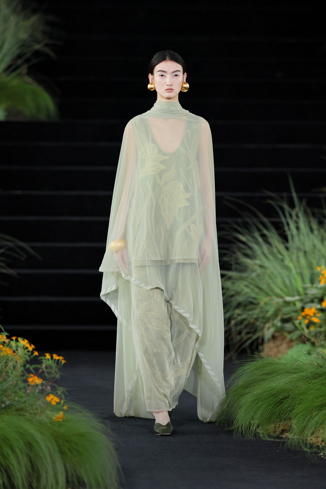 廓形上,圆形、茧形、弧线始终是品牌的核心语汇。本季首套出场造型,上衣结构展开时是一个完整而包裹的圆形轮廓,如天地未分时的混沌一体,穿在人身上时,轮廓又随身体回归收合状态。裙身保持轻盈悬浮,与内层裤装形成层次对比。这些弧线包容身体,却不刻意勾勒或束缚。衣服与人体之间,始终留有一层空气可以流动的空间,正是这层空间,让女性气质的游走得以发生。