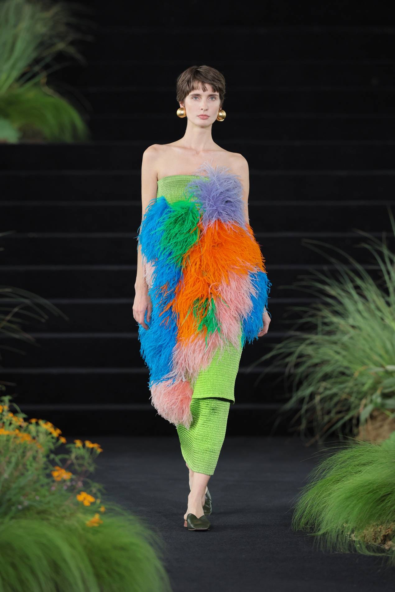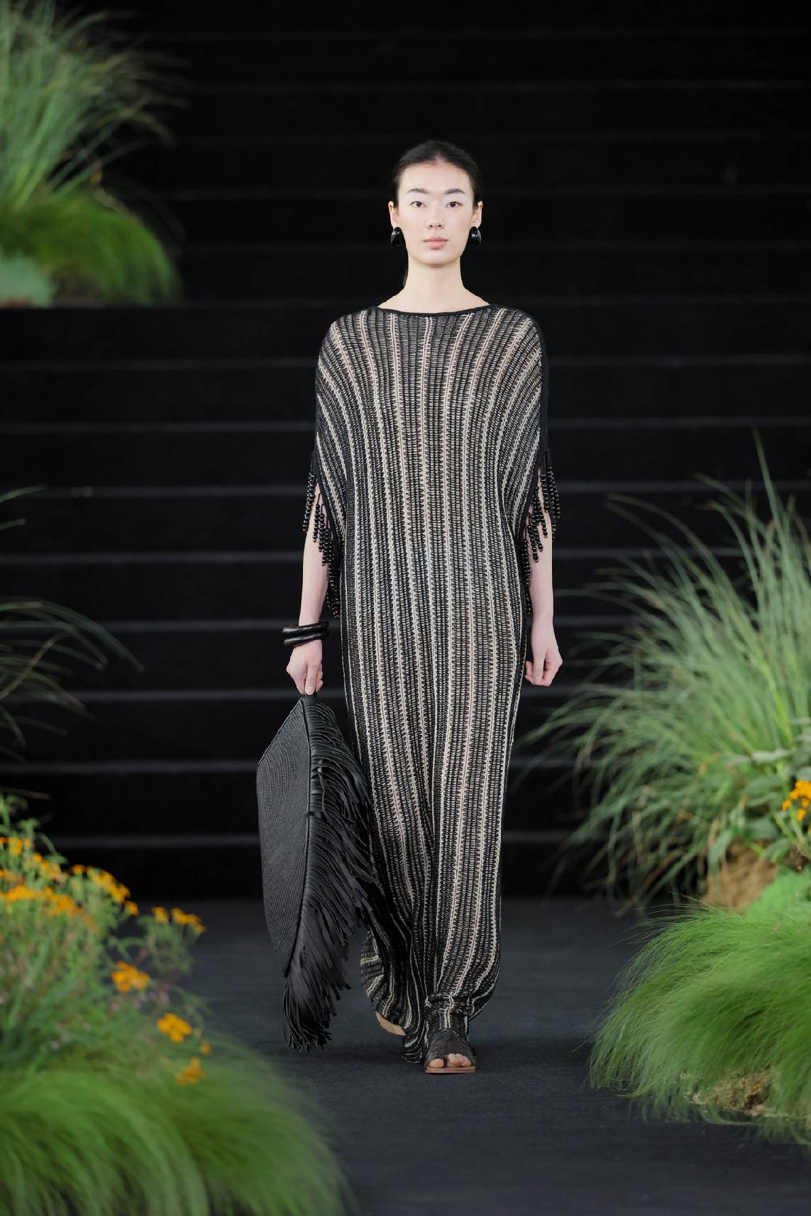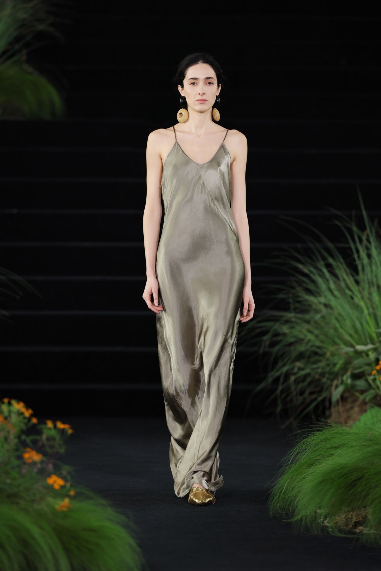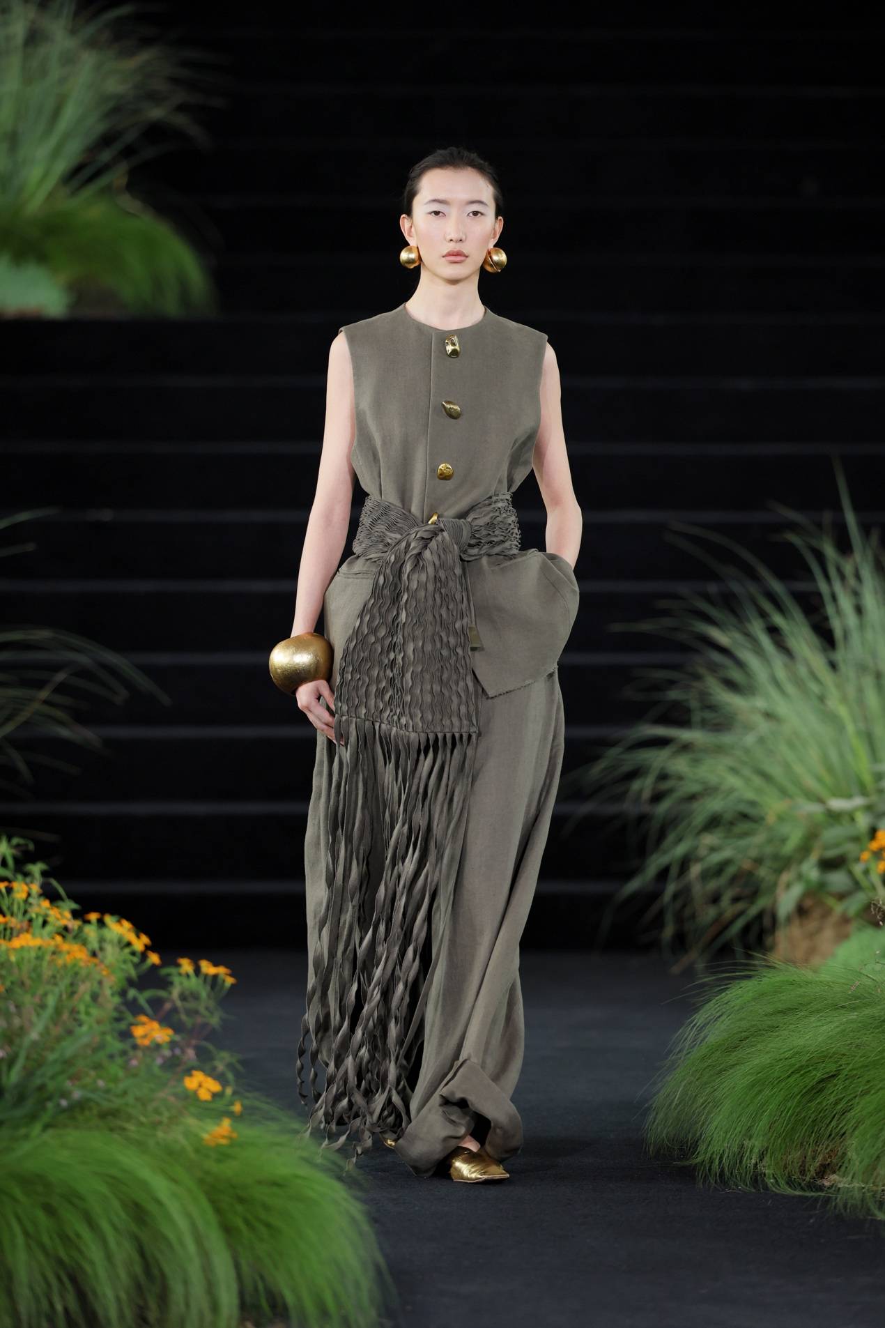 而后水意渐收,换上草木的青绿和亚麻的柔黄,色彩开始有了林间土木的重量。一袭灰绿色的缎面裙装到来,宣告森林由白昼进入夜晚,那定是月色如银,在树叶油亮的表面跳动。条纹针织罩衫下摆坠有黑色木球串,随模特行走发出声响。夜色中,金色松鼠爬上面料,在动态中反射出不同方向的光线,仿生的效果从具体的形,延展到林间忽明忽暗、忽静忽动的生命韵律。穿上它的人,仿佛正穿过一片深林,松鼠在视线远处一闪而过,衣身替她记下了这一切。