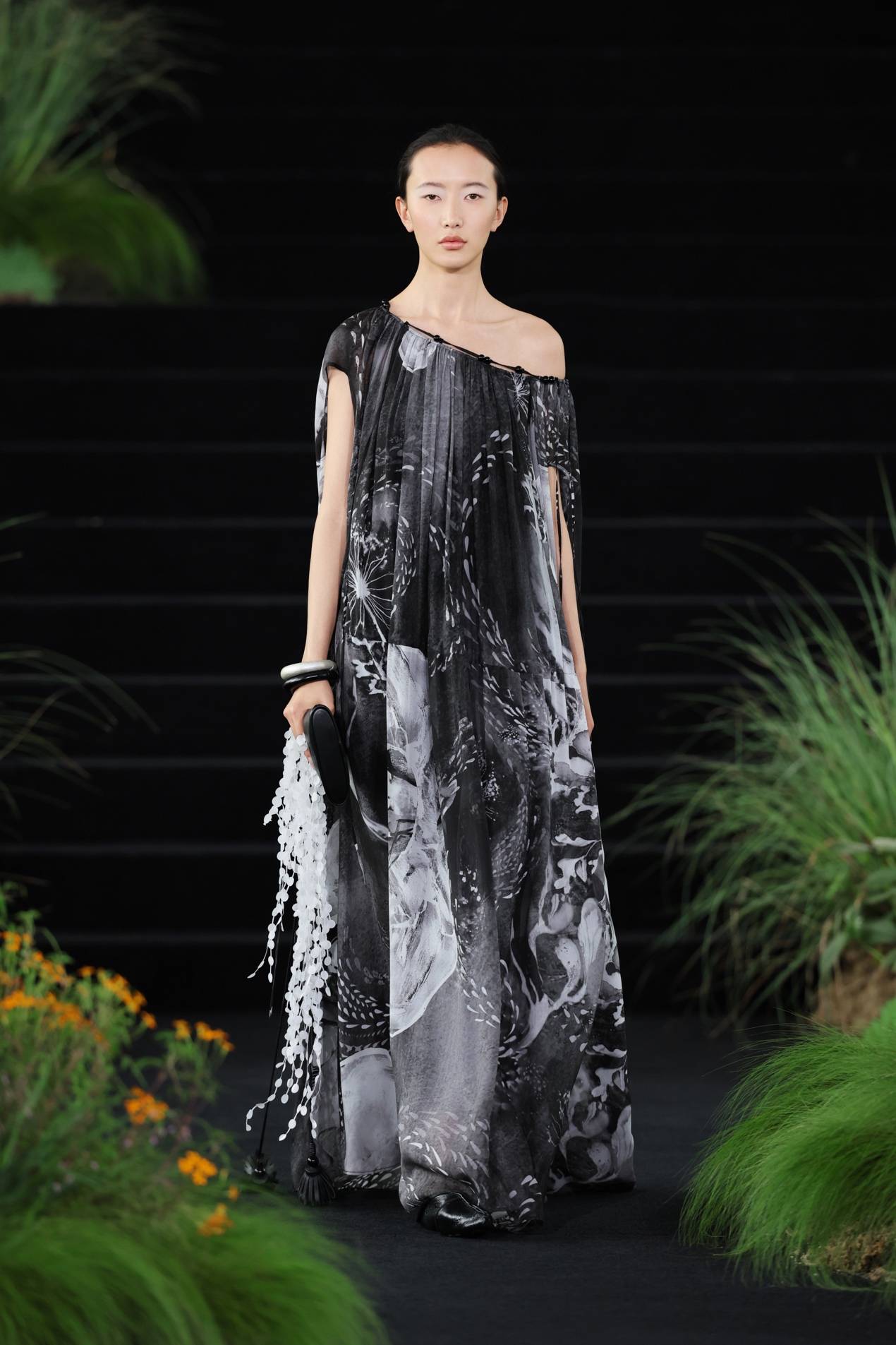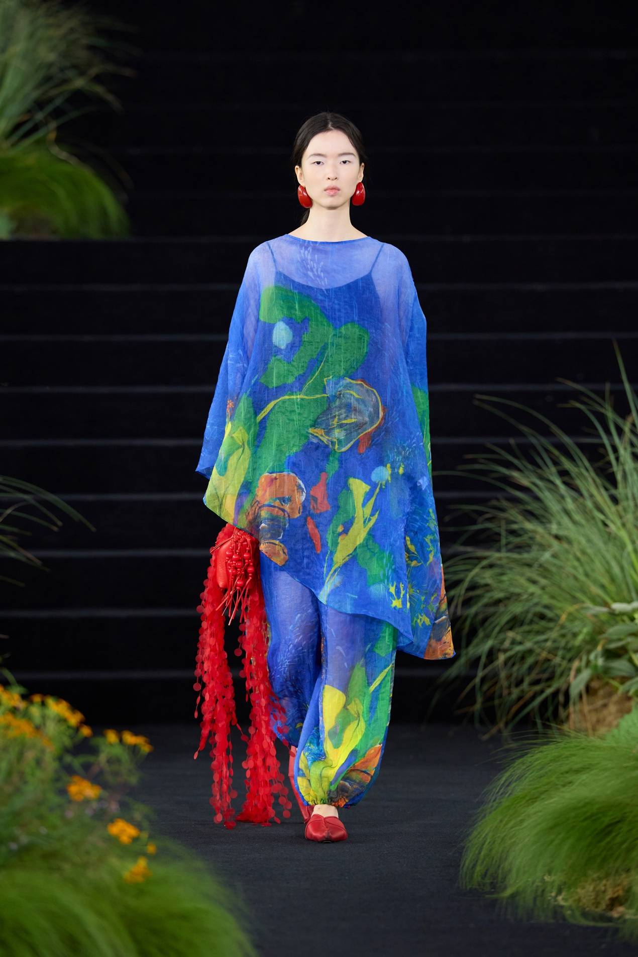 之后的几套造型继续保持黑白,但我们已由林入海。在深海极处,光被隐匿,黑白花稿正是捕捉了海底视角。那些静默的生物呈现白色,是模拟了深海鱼类的自发光器官,转念一想,又像人类的梦——据说大部分人的梦都没有色彩。随着高度上升,光线引入,视界有了色彩。先是两套粉色造型过渡,模特手持红色流苏包款款走来,有如两株珊瑚。由此,色彩开始最大幅度的展开,一袭蓝袍之上,缤纷笔触虽无具体轮廓,却写意呈现热带浅海内,藻类、珊瑚、鱼群的生态世界。三层分离式组织,利用抽绳原理,中层织线的收缩使表面产生起伏肌理,宛如水波在衣身上缓慢生成。印花与织物结构叠加,使视觉产生如同在水中扭曲模糊的效果。红色水母化作连衣裙,而一条绿裙之上,彩色流苏模拟海藻,随模特步履而动,让周遭的空气变成了它们飘荡其中的海水。