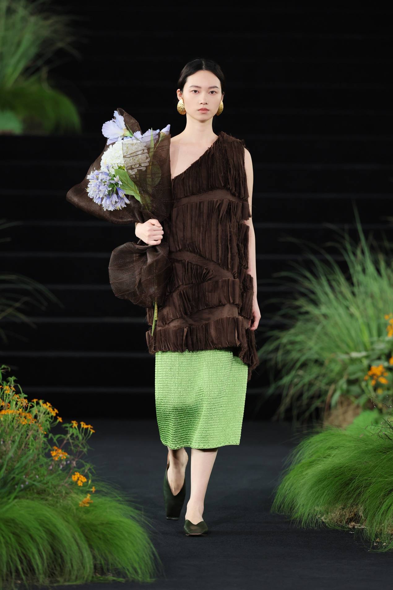 旅程的尽头,是黄昏时分光落在大地上的颜色。褐色碎布排列于裙装之上,被集体切割出大块凹凸,模拟树木的皮肤。但这一章节并非回到林间,而是描摹风与鸟。画面独剩树干时,鸟已乘风而去,这正是东方的审美意趣。更多暖褐色的衣料在空气中层层展开,廓形愈发松弛,宽阔的衣摆、延展的侧幅、开衩与不对称的层叠结构,让空气自由进入衣身,在步履间将衣摆托起。仿生走到这里,已不再需要模拟任何具体的生灵,衣服本身已经成为一阵风,一声鸟鸣的回响。