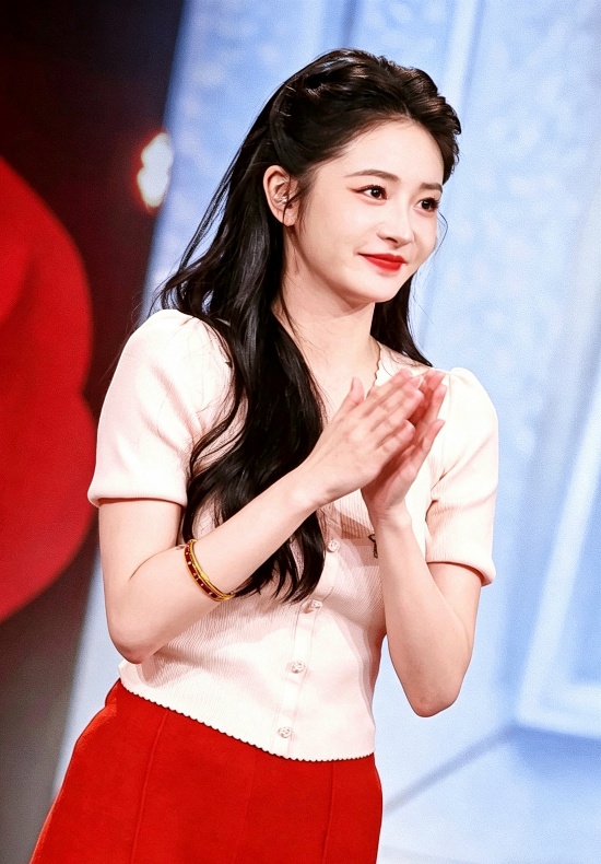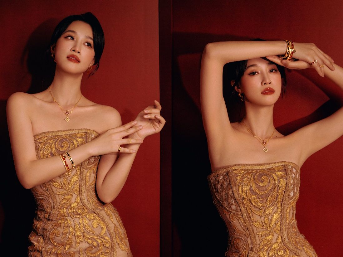 梁静以周大福标志性传福、传喜系列呈现东方摩登质感。耳畔的传喜耳饰凭借现代设计将“喜”字进行排列组合,璀璨钻石点缀其间,传递“喜上加喜”的美好寓意。梁静腕间的足金手链同样光彩夺目,福字金面首尾相接,尽显传福系列的文化底蕴。